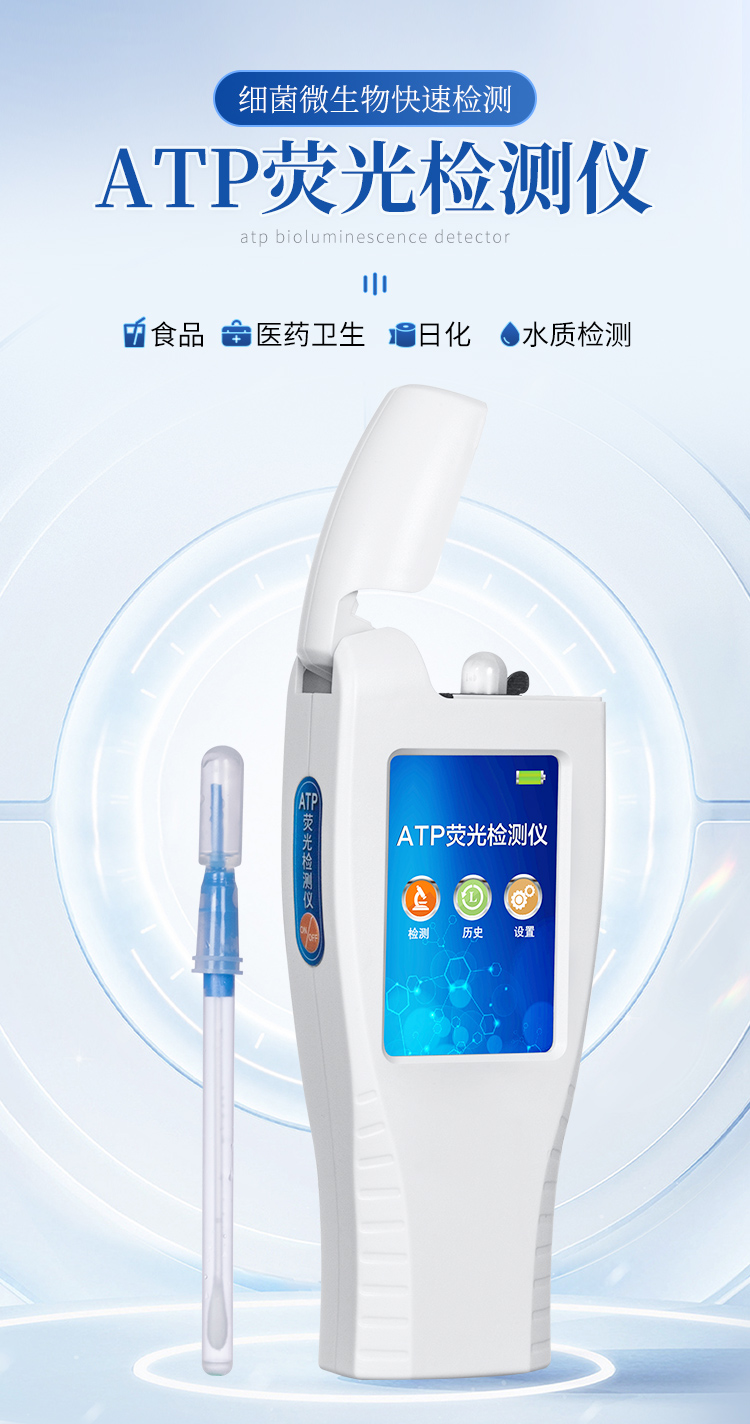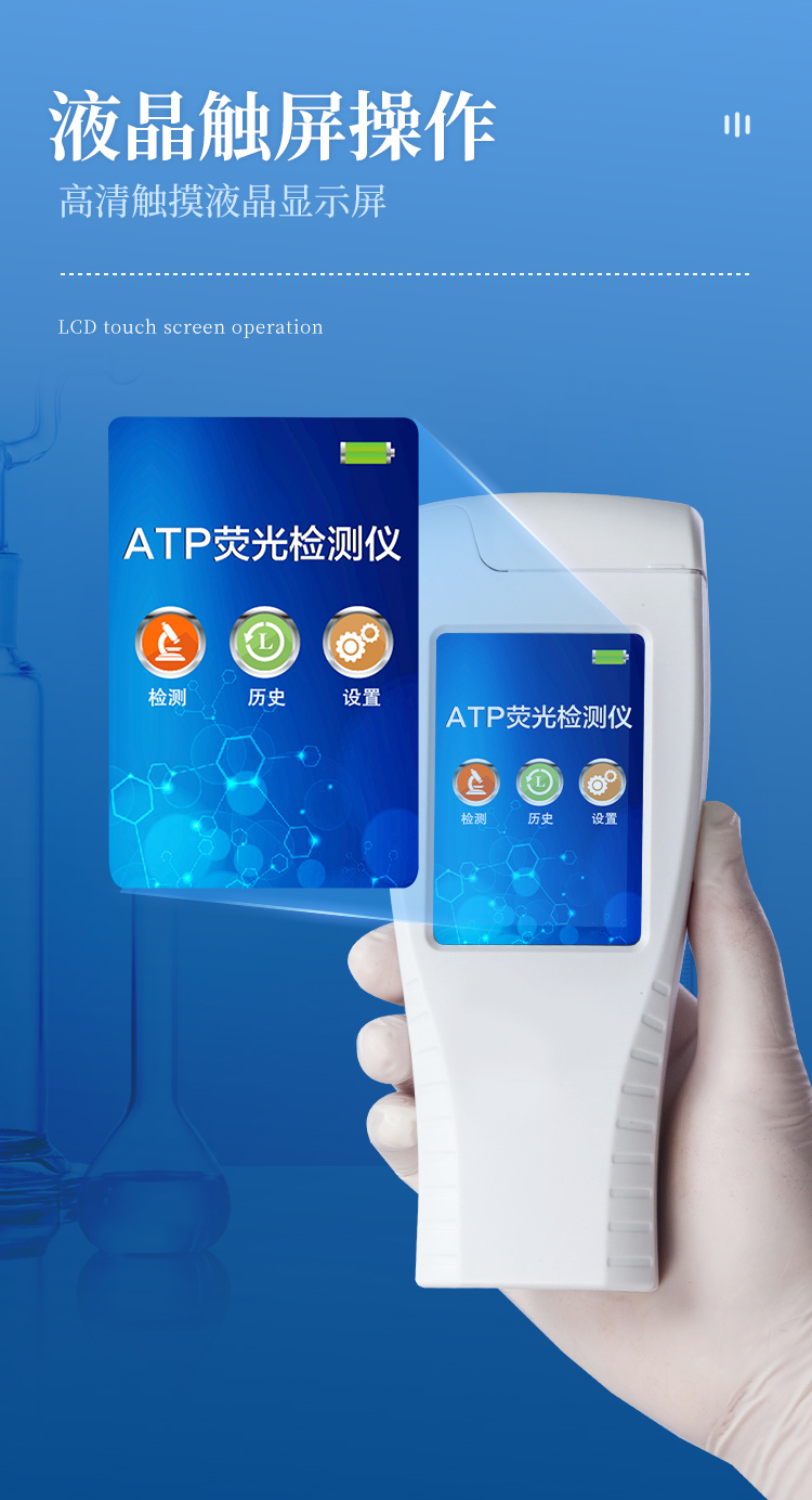 該設備為全新升級產品,安卓智能操作系統。操作采用生物化學反應方法檢測ATP含量,ATP熒光檢測儀基于螢火蟲發光原理,利用“熒光素酶—熒光素體系”快速檢測三磷酸腺苷(ATP)。ATP拭子含有可以裂解細胞膜的試劑,能將細胞內ATP釋放出來,與試劑中含有的特異性酶發生反應,產生光,再用熒光照度計檢測發光值,微生物的數量與發光值成正比,由于所有生物活細胞中含有恒量的ATP,所以ATP含量可以清晰地表明樣品中微生物與其他生物殘余的多少,用于判斷衛生狀況。