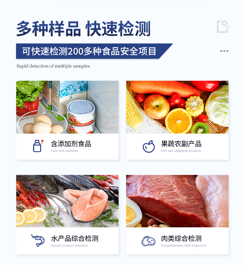 可快速檢測病害肉、組胺、揮發(fā)性鹽基氮,儀器預留其他項目檢測程序和端口,根據(jù)日后需求可方便的自主增加檢測項目。