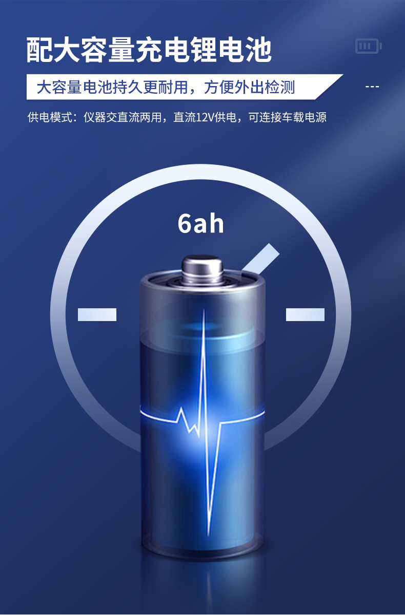 2、直流12V供電,可連接車載電源,可配6ah大容量充電鋰電池,方便戶外流動測試。