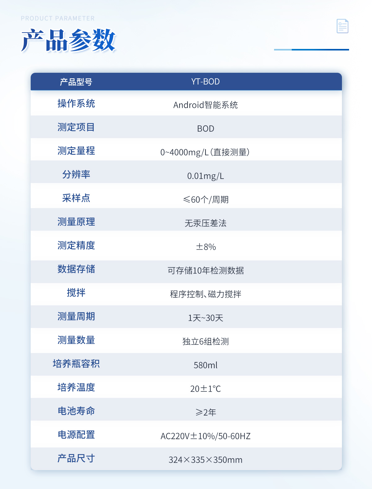 生化需氧量(BOD)測定儀是根據國家標準《HJ505-2009》5日培養法,模擬自然界中有機物的生物降解過程,采用簡單、安全、可靠的無汞壓差感測法測量水中BOD濃度;全智能化設計,**的研發工藝和設計制造,實驗過程無需實驗人員值守;適用于排污企業、環境監測、污水處理廠、第三方檢測機構、科研、高校等領域的生化需氧量測定。