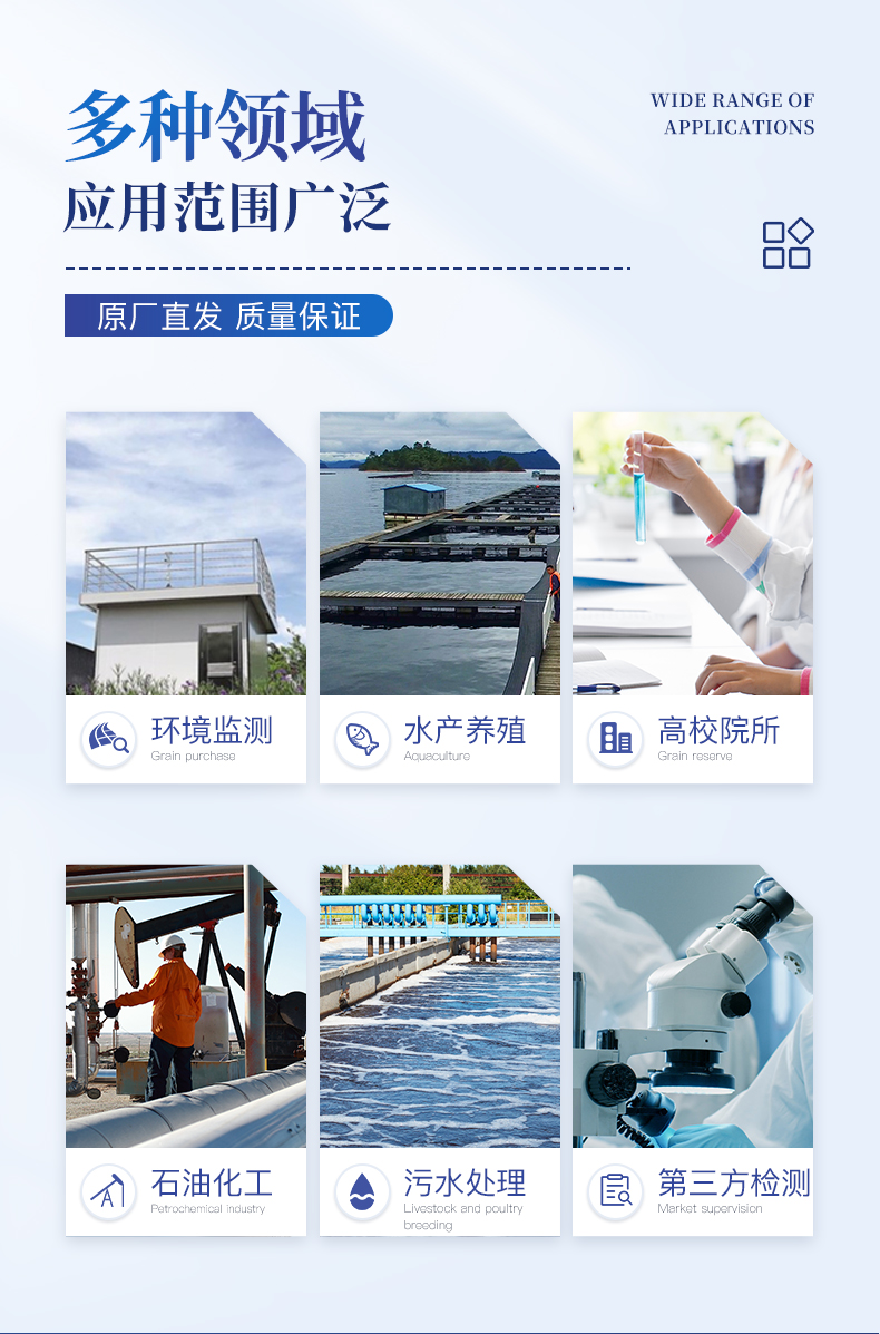適用于生活污水、工業(yè)廢水、地下水、地表水中多種水質(zhì)污染物的檢測(cè);運(yùn)用于水質(zhì)檢測(cè)實(shí)驗(yàn)室、市政、污水處理廠、環(huán)境監(jiān)測(cè)站及教育科研高校、電廠、疾控中心、造紙電鍍、水產(chǎn)養(yǎng)殖、生物制藥、石化、煤炭、冶金、紡織、食品等行業(yè)的水質(zhì)分析。