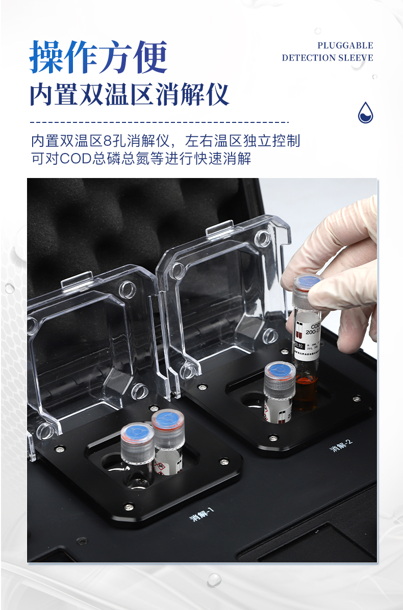 4、內(nèi)置雙溫區(qū)8孔消解儀,左右溫區(qū)獨(dú)立控制,可對(duì)COD總磷總氮等進(jìn)行快速消解。