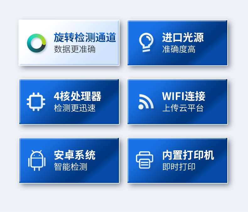 3、顯示屏幕:儀器采用7英寸液晶觸摸屏,搭配運行安卓智能操作系統,主控芯片采用ARM Cortex-A7,RK3288/4核處理器,主頻1.88Ghz,操作方便,性能更強。