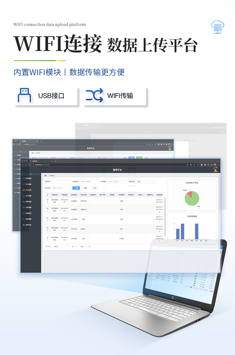 8.3、數據監管系統:同步對接監管平臺,數據可局域網和互聯網數據上傳,檢測結果可選擇直接傳至食品安全監管平臺。進行區域食品安全監管及大數據分析處理與數據統計,檢測區域食品安全長短期動態,達到食品安全問題預估、預警。8.4、打印系統:內置全新打印機,可以打印:項目名稱,二維碼,抽樣信息、檢測信息,受檢信息、復核信息、抽樣日期、檢測日期等信息的打印。