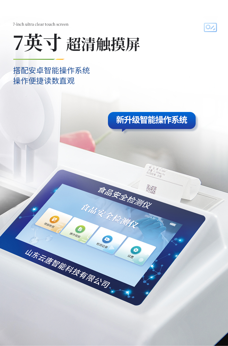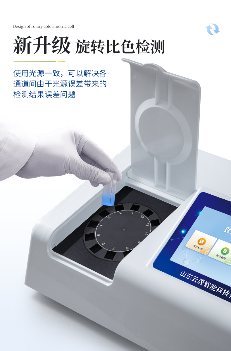 | 1、儀器采用臺(tái)式一體化系統(tǒng)檢測(cè)技術(shù),將分光光度模塊、數(shù)字化管理模塊、無(wú)線通訊模塊高度集成于一體,支持檢測(cè)幾十種食品安全檢測(cè)項(xiàng)目,同時(shí)預(yù)留升級(jí)檢測(cè)方法。 | 2、儀器檢測(cè)模塊標(biāo)準(zhǔn)化、智能化,檢測(cè)項(xiàng)目可隨意自由組合。檢測(cè)箱體內(nèi)置多個(gè)標(biāo)準(zhǔn)檢測(cè)單元,檢測(cè)模塊可以調(diào)整配置。 | 3、顯示屏幕:儀器采用7英寸液晶觸摸屏,搭配運(yùn)行安卓智能操作系統(tǒng),主控芯片采用ARM Cortex-A7,RK3288/4核處理器,主頻1.88Ghz,操作方便,性能更強(qiáng)。 | 4、檢測(cè)通道:≥12通道;采用精密旋轉(zhuǎn)比色池設(shè)計(jì),使用同芯片同光源校準(zhǔn)精度,解決不同光源之間的誤差值,更加準(zhǔn)確**。 | 5、儀器光源:高精度進(jìn)口四波長(zhǎng)冷光源,每個(gè)通道均配置 410、520、590、630nm 波長(zhǎng)光源,標(biāo)配**的光路切換裝置,專利光路切換功能可實(shí)現(xiàn)64波長(zhǎng),并且所有檢測(cè)項(xiàng)目可實(shí)現(xiàn)所有通道同時(shí)檢測(cè)。 | 6、通訊接口:配備無(wú)線通信模塊、可選配4G(APN)通訊模塊和藍(lán)牙傳輸,同時(shí)具有USB接口,可以多方式實(shí)現(xiàn)數(shù)據(jù)保存及數(shù)據(jù)傳輸。 | 7、存儲(chǔ)方式:支持U盤存儲(chǔ),標(biāo)準(zhǔn)USB接口,免驅(qū)動(dòng)安裝。檢測(cè)結(jié)果存儲(chǔ)容量20萬(wàn)條以上,可生成Excel表格進(jìn)行拷貝,并具有登錄保護(hù)功能。 | 8、智能化操作系統(tǒng): | 8.1、操作系統(tǒng):儀器可在同一檢測(cè)界面自動(dòng)對(duì)應(yīng)相關(guān)檢測(cè)通道,一次性選擇1-12個(gè)樣品名稱,無(wú)需退出界面,節(jié)省操作時(shí)間。并可以對(duì)每個(gè)通道屬性和樣品信息單獨(dú)進(jìn)行編輯,例如送檢單位、人員,檢測(cè)人員等,打印時(shí)勾選打印顯示。 | 8.2、限量規(guī)判系統(tǒng):具有限量查詢、添加物質(zhì)合規(guī)判定系統(tǒng)。檢測(cè)出結(jié)果后,系統(tǒng)自動(dòng)調(diào)用系統(tǒng)數(shù)據(jù)庫(kù)中相關(guān)國(guó)標(biāo)進(jìn)行比對(duì)判定,客觀顯示結(jié)果是否合格。 | 8.3、數(shù)據(jù)監(jiān)管系統(tǒng):同步對(duì)接監(jiān)管平臺(tái),數(shù)據(jù)可局域網(wǎng)和互聯(lián)網(wǎng)數(shù)據(jù)上傳,檢測(cè)結(jié)果可選擇直接傳至食品安全監(jiān)管平臺(tái)。進(jìn)行區(qū)域食品安全監(jiān)管及大數(shù)據(jù)分析處理與數(shù)據(jù)統(tǒng)計(jì),檢測(cè)區(qū)域食品安全長(zhǎng)短期動(dòng)態(tài),達(dá)到食品安全問(wèn)題預(yù)估、預(yù)警。 | 8.4、打印系統(tǒng):內(nèi)置全新打印機(jī),可以打印:項(xiàng)目名稱,二維碼,抽樣信息、檢測(cè)信息,受檢信息、復(fù)核信息、抽樣日期、檢測(cè)日期等信息的打印。 | 9、供電模式:儀器交直流兩用,直流12V供電(標(biāo)配),可連接車載電源,亦可選配6ah大容量充電鋰電池,電量可實(shí)時(shí)顯示,方便戶外流動(dòng)測(cè)試。 | 10、儀器具有重新校準(zhǔn)、鎖定、恢復(fù)出廠設(shè)置功能, | 11、外觀尺寸:415X310X150(mm) ,并可加配鋁合金手提箱 |
