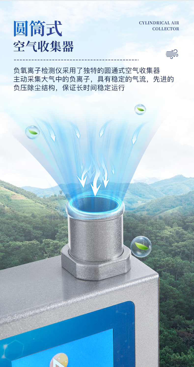 采用“電容式吸入法”原理進行負離子檢測,測量空氣中的負離子濃度值。在離子傳感器(或稱采集桶、采集筒)的極化板(或稱偏壓板)上加載定量的極化電壓,再讓被測空氣按設定速度勻速通過傳感器。空氣中特定的小粒徑負離子在電場的作用下發生偏轉,被采集板所捕獲。采集到的負離子負電荷量經過采集器的處理,即可計算出負離子的電荷濃度值。