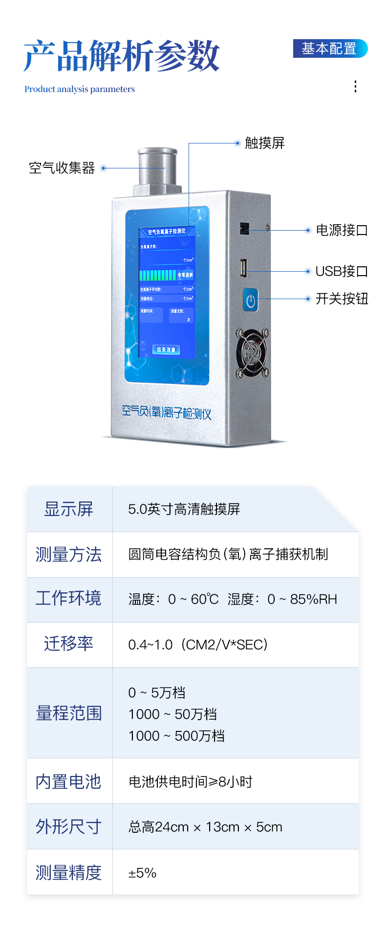 1、屏幕顯示:5.0英寸電容觸摸屏,800*480高分辨率,實時顯示負(氧)離子測量結果;