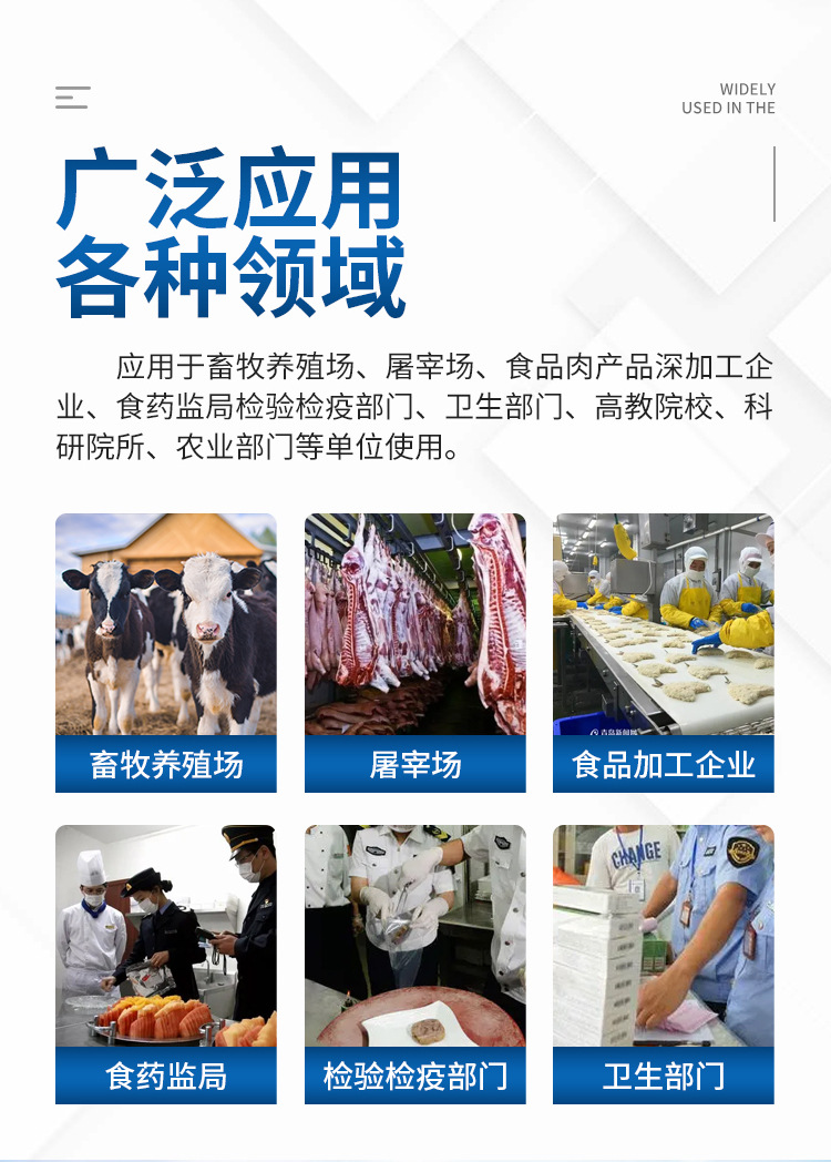 該儀器廣泛應(yīng)用于食藥監(jiān)局、衛(wèi)生監(jiān)督部門、高教院校、科研院所、農(nóng)業(yè)部門、商業(yè)系統(tǒng)養(yǎng)殖場、屠宰場、食品肉產(chǎn)品深加工企業(yè)、畜牧獸醫(yī)、檢驗檢疫部門、食品生產(chǎn)企業(yè)、農(nóng)副產(chǎn)品批發(fā)市場、農(nóng)業(yè)生產(chǎn)基地、超市、餐廳、食堂、等單位部門對食品中的不安全指標(biāo)進(jìn)行監(jiān)測使用。