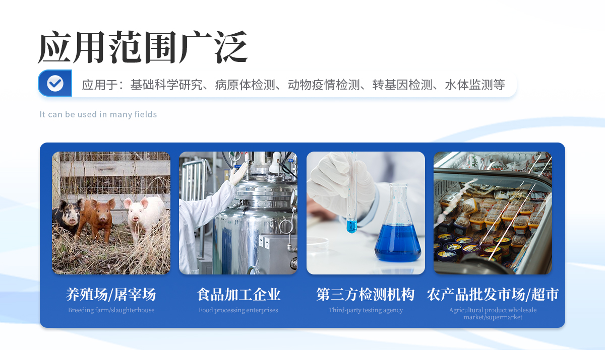 | 1、食品安全: 致病微生物、農(nóng)獸藥殘留、生物毒素等快速篩查。 | 2、畜牧獸醫(yī): 動物疫病診斷、動物源性安全指標(biāo)檢測。 | 3、環(huán)境監(jiān)測: 水質(zhì)、土壤特定污染物篩查。 | 4、科研與生物安全: 免疫層析實驗定量分析、生物因子檢測。 | 5、其他領(lǐng)域: 所有使用膠體金免疫層析試紙條的場景。 |