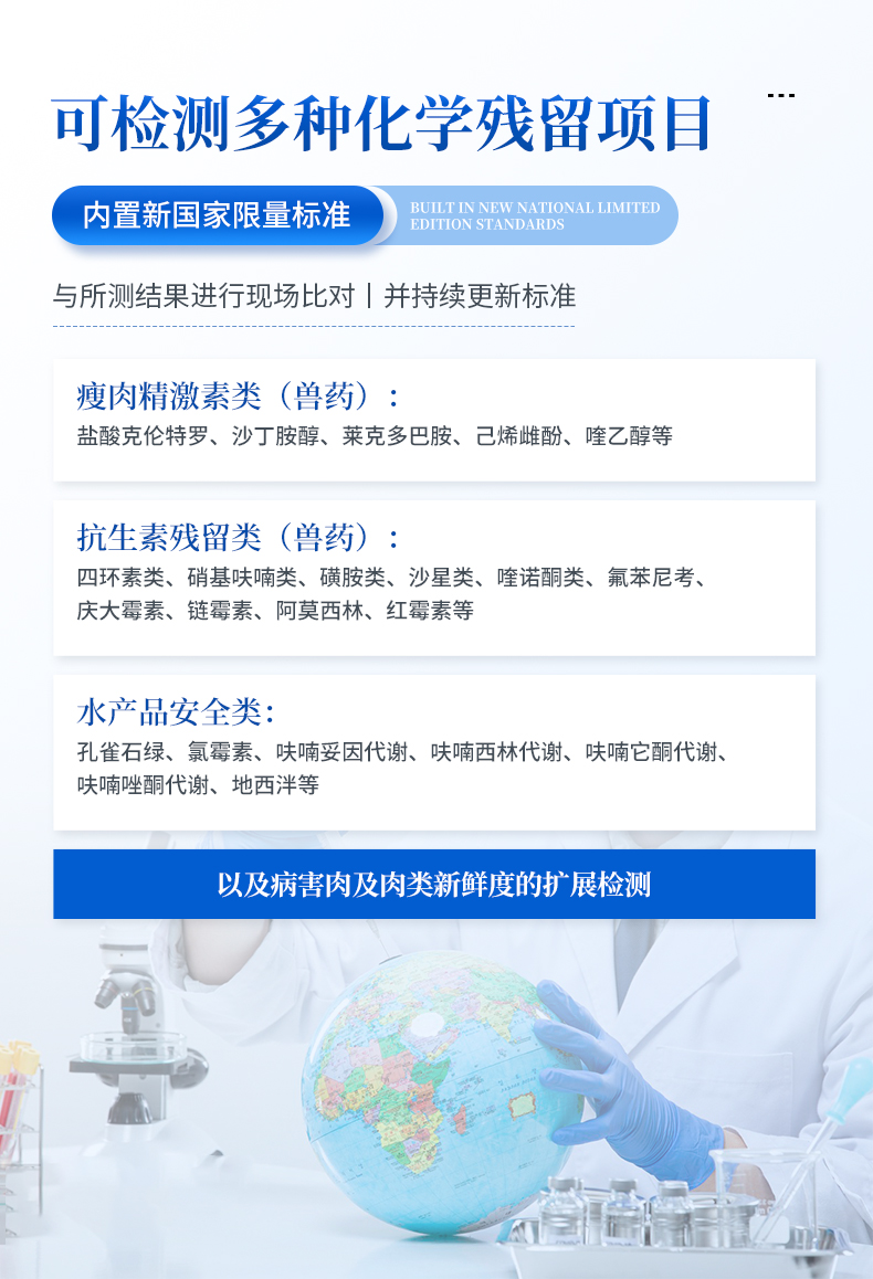 獸藥(抗生素殘留類):四環素類、硝基呋喃類、磺胺類、沙星類、喹諾酮類、慶大霉素、鏈霉素、阿莫西林、紅霉素等