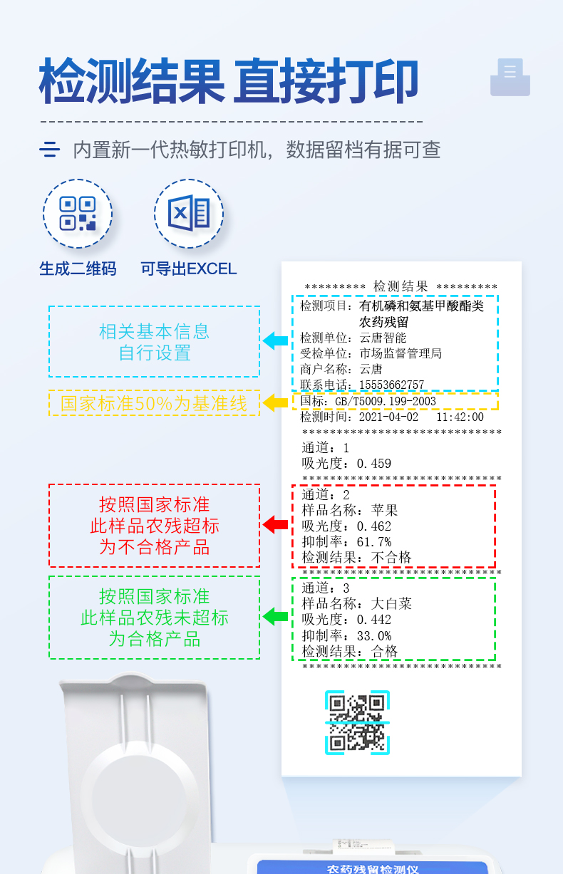 | 安卓智能操作系統(tǒng),采用更加**和人性化操作,儀器具有無線聯(lián)網(wǎng)上傳功能,快速上傳數(shù)據(jù),進(jìn)行數(shù)據(jù)統(tǒng)計和分析。 | 智能化程度高,儀器具有自檢功能:具有開機(jī)自檢和調(diào)零功能,具有自動檢測重復(fù)性功能;同時,檢測完成可自動打印檢測報告和二維碼。手機(jī)掃碼可顯示出詳細(xì)檢測信息。 | 儀器帶有監(jiān)管平臺,數(shù)據(jù)可局域網(wǎng)和互聯(lián)網(wǎng)數(shù)據(jù)上傳,檢測結(jié)果直接傳至食品安全監(jiān)管平臺。進(jìn)行區(qū)域食品安全監(jiān)管及大數(shù)據(jù)分析處理與數(shù)據(jù)統(tǒng)計,檢測區(qū)域食品安全長短期動態(tài),達(dá)到食品安全問題預(yù)估、預(yù)警 。 | 樣品處理簡單省力,整體操作快速、安全、便捷。 | 儀器具有自身保護(hù)功能,可設(shè)置用戶名及密碼,防止非工作人員操作等。 | 內(nèi)置強(qiáng)大的數(shù)據(jù)庫,可在儀器上直接選擇樣品名稱、檢測指標(biāo)、送檢單位等信息,也可在儀器上直接編輯錄入樣品名稱、檢測指標(biāo)、送檢單位等信息并保存進(jìn)樣品數(shù)據(jù)庫,方便后期操作調(diào)取使用。 | 儀器具有重新校準(zhǔn)、鎖定、恢復(fù)出廠設(shè)置功能。 |