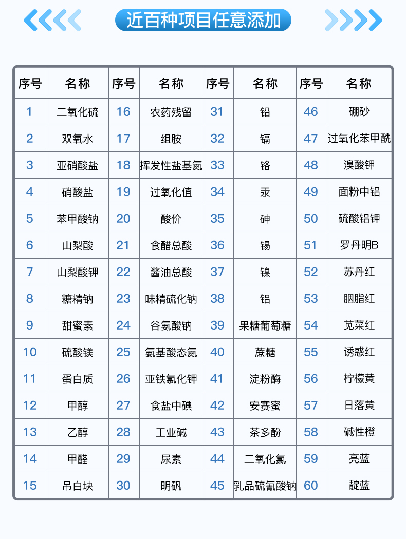 可快速檢測各類食品中的甲醛、二氧化硫、亞硝酸鹽、吊白塊的含量,儀器預留其他項目檢測程序和端口,根據日后需求可方便的自主增加檢測項目。