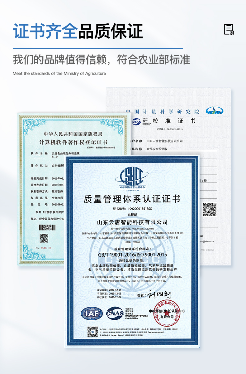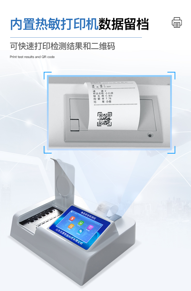 | 安卓智能操作系統(tǒng),采用更加**和人性化操作,儀器具有網(wǎng)線連接、wifi聯(lián)網(wǎng)上傳、GPRS無線遠傳功能,快速上傳數(shù)據(jù)。 | 智能化程度高,儀器具有自檢功能:具有開機自檢和調(diào)零功能,具有自動檢測重復性功能。 | 檢測通道:≥12個檢測通道,可以同時測試多個樣品,每個樣品由程序控制分別獨立工作,不會互相干擾。 | 顯示方式:≥8英寸液晶觸摸屏顯示,人性化中文操作界面,讀數(shù)直觀、簡單。 | 配備新一代嵌入式熱敏打印機,可選擇手動打印或者自動打印,檢測完成可自動打印檢測報告和二維碼。 | 光源采用進口超高亮發(fā)光二極管,高精度、穩(wěn)定性強、光源可控、可以關掉不使用的光源,功耗更低。 | 采用USB2.0接口設計,方便數(shù)據(jù)的存貯和移動,并可隨時與計算機直接相連,并且可用計算機控制儀器。實現(xiàn)數(shù)據(jù)查詢、瀏覽、分析、統(tǒng)計、打印等。 | 儀器帶有監(jiān)管平臺。數(shù)據(jù)可局域網(wǎng)和互聯(lián)網(wǎng)數(shù)據(jù)上傳,檢測結果直接傳至食品安全監(jiān)管平臺。進行區(qū)域食品安全監(jiān)管及大數(shù)據(jù)分析處理,檢測區(qū)域食品安全長短期動態(tài),達到食品安全問題預估、預警 | 一體化便攜式快檢設備,滿足現(xiàn)場及流動檢測使用需求,能夠在同一軟件下實現(xiàn)所有檢測項目的檢測,并可通過同一窗口直觀顯示檢測結果。 | 儀器具有多品類多種類樣品菜單庫,可靈活選擇檢測樣品,不同的檢測通道可同時檢測不同的樣品項目。也可在儀器上直接編輯錄入樣品名稱、檢測指標、送檢單位等信息并保存進樣品數(shù)據(jù)庫。 | 樣品處理簡單省力,整體操作快速、安全、便捷。 | 儀器具有自身保護功能,可設置用戶名及密碼,防止非工作人員操作等。 | 高靈敏度,高檢測精度,高重復性精度,掃描式高精度光學傳感器。 | 儀器具有重新校準、鎖定、恢復出廠設置功能。 | 支持U盤存儲。 結果判定線可修改,對照值標定值可保存,斷電不丟失數(shù)據(jù)。 |