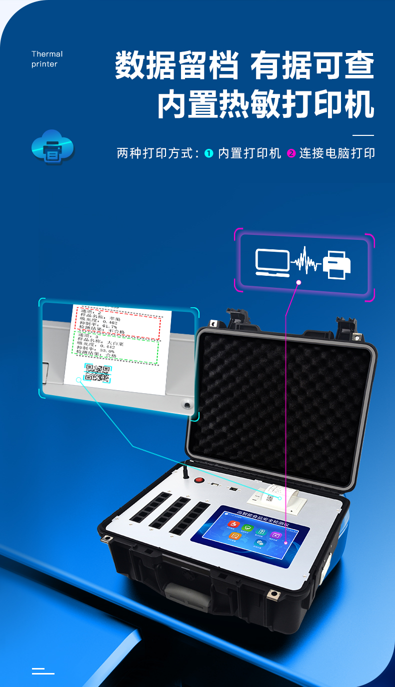 | 儀器采用手提式一體化系統(tǒng)檢測(cè)技術(shù),將分光光度模塊、膠體金檢測(cè)模塊、新型農(nóng)殘檢測(cè)模塊、數(shù)字化管理模塊、無(wú)線通訊模塊高度集成于一體,支持檢測(cè)200種食品安全檢測(cè)項(xiàng)目,同時(shí)預(yù)留升級(jí)檢測(cè)方法。 | 儀器檢測(cè)模塊標(biāo)準(zhǔn)化、智能化,檢測(cè)項(xiàng)目可隨意自由組合。檢測(cè)箱體內(nèi)置多個(gè)標(biāo)準(zhǔn)檢測(cè)單元,檢測(cè)模塊可以調(diào)整配置。 | 顯示屏幕:儀器采用10.1英寸液晶觸摸屏顯,搭配運(yùn)行安卓智能操作系統(tǒng),主控芯片采用ARM Cortex-A7,RK3288/4核處理器,主頻1.88Ghz,運(yùn)轉(zhuǎn)速度更快速,性能更強(qiáng)。 | 檢測(cè)通道:≥12通道;采用精密旋轉(zhuǎn)比色池設(shè)計(jì),使用光源芯片一致,可以解決各通道間由于光源芯片不同帶來(lái)的檢測(cè)結(jié)果誤差問(wèn)題,檢測(cè)結(jié)果更加精準(zhǔn),1-12通道間誤差0.1%,***:**202022821055.2。 | 儀器光源:高精度進(jìn)口四波長(zhǎng)冷光源,每個(gè)通道均配置 410、520、590、630nm 波長(zhǎng)光源,標(biāo)配**的光路切換裝置,專(zhuān)利光路切換功能可實(shí)現(xiàn)*多64波長(zhǎng),并且所有檢測(cè)項(xiàng)目可實(shí)現(xiàn)所有通道同時(shí)檢測(cè)。 | 設(shè)備具備開(kāi)機(jī)自動(dòng)校準(zhǔn)及一鍵校準(zhǔn)功能,確保檢測(cè)數(shù)據(jù)結(jié)果準(zhǔn)確。 | 通訊接口:配備無(wú)線通信模塊、4G(APN)通訊模塊、藍(lán)牙傳輸,同時(shí)具有雙USB接口以及RJ45網(wǎng)線接口,可以多方式實(shí)現(xiàn)數(shù)據(jù)保存及數(shù)據(jù)傳輸。 | 存儲(chǔ)方式:支持U盤(pán)存儲(chǔ),標(biāo)準(zhǔn)USB接口,免驅(qū)動(dòng)安裝。檢測(cè)結(jié)果存儲(chǔ)容量20萬(wàn)條以上,可生成Excel表格進(jìn)行拷貝,并具有登錄保護(hù)功能。 | 智能化操作系統(tǒng): 操作系統(tǒng):可在同一檢測(cè)界面自動(dòng)對(duì)應(yīng)相關(guān)檢測(cè)通道,一次性選擇1-12個(gè)樣品名稱(chēng),無(wú)需退出界面,節(jié)省操作時(shí)間。檢測(cè)通道可以分別打開(kāi)與關(guān)閉并對(duì)檢測(cè)通道屬性和樣品信息進(jìn)行編輯,例如送檢單位、人員,檢測(cè)人員等,打印時(shí)一并顯示。 數(shù)據(jù)集成系統(tǒng):設(shè)備首頁(yè)自動(dòng)統(tǒng)計(jì)檢測(cè)數(shù)據(jù),包含:周檢測(cè)數(shù)據(jù)、月檢測(cè)數(shù)據(jù),全部檢測(cè)總數(shù)量,均包含檢測(cè)總數(shù),合格數(shù),不合格數(shù),以及相關(guān)柱形分析圖,對(duì)各項(xiàng)檢測(cè)數(shù)據(jù)清晰掌握,無(wú)需電腦查詢(xún),更加快捷直觀。 數(shù)據(jù)庫(kù)系統(tǒng):具有多品類(lèi)多種類(lèi)樣品菜單功能,并且構(gòu)建了完善的檢索、修訂功能。食品庫(kù)涵蓋多種菜單庫(kù)100多種蔬菜名稱(chēng),可按需添加或刪除、編輯蔬菜名稱(chēng);不同的檢測(cè)通道可同時(shí)檢測(cè)不同的樣品,產(chǎn)品數(shù)據(jù)庫(kù)以及歷史檢測(cè)記錄支持一鍵檢索功能。 限量規(guī)判系統(tǒng):具有限量查詢(xún)、添加物質(zhì)合規(guī)判定系統(tǒng)。檢測(cè)出結(jié)果后,系統(tǒng)自動(dòng)調(diào)用系統(tǒng)數(shù)據(jù)庫(kù)中相關(guān)國(guó)標(biāo)進(jìn)行比對(duì)判定,客觀顯示判定結(jié)果是否合格。 項(xiàng)目預(yù)設(shè)系統(tǒng):儀器具有任務(wù)預(yù)設(shè)模塊,可在樣品送檢前提前預(yù)設(shè)樣品名稱(chēng)、檢測(cè)指標(biāo)、送檢單位、檢測(cè)單位等信息,樣品送檢時(shí)一鍵調(diào)取保存信息,并可多次調(diào)取,大大提高檢測(cè)效率。 數(shù)據(jù)監(jiān)管系統(tǒng):同步對(duì)接監(jiān)管平臺(tái),數(shù)據(jù)可局域網(wǎng)和互聯(lián)網(wǎng)數(shù)據(jù)上傳,檢測(cè)結(jié)果可選擇直接傳至食品安全監(jiān)管平臺(tái)。進(jìn)行區(qū)域食品安全監(jiān)管及大數(shù)據(jù)分析處理與數(shù)據(jù)統(tǒng)計(jì),檢測(cè)區(qū)域食品安全長(zhǎng)短期動(dòng)態(tài),達(dá)到食品安全問(wèn)題預(yù)估、預(yù)警。 自定義打印系統(tǒng):內(nèi)置熱敏打印機(jī);系統(tǒng)打印格式多樣化,產(chǎn)品合格證(國(guó)家農(nóng)業(yè)部標(biāo)準(zhǔn)要求),二維碼,抽樣信息、檢測(cè)信息,受檢信息、復(fù)核信息、抽樣日期、檢測(cè)日期等信息結(jié)果,可按實(shí)際需求自行設(shè)置開(kāi)啟或關(guān)閉,并完成打印。 | 供電模式:儀器主機(jī)采用一體化防水、抗壓、防撞擊、防腐蝕機(jī)體設(shè)計(jì),可直接使用交流電源;內(nèi)置6ah大容量充電鋰電池,可連續(xù)使用8小時(shí)以上,滿(mǎn)足脫電情況下檢測(cè)需求。 | 膠體金檢測(cè)模塊: 采用雙通道CMOS成像處理技術(shù)及膠體金免疫層析技術(shù),可同時(shí)讀取雙膠體金卡數(shù)據(jù),自動(dòng)采集、處理分析,將檢測(cè)結(jié)果顯示,并可根據(jù)參考限值自動(dòng)判斷檢測(cè)結(jié)果,可檢測(cè)常見(jiàn)的獸藥殘留、生物毒素、抗生素、違禁添加物等。 探測(cè)技術(shù):CMOS成像探測(cè); 檢測(cè)通道:3通道,可同時(shí)讀取3個(gè)膠體金卡數(shù)據(jù); 檢測(cè)方式:消線法和比色法; 顯示模式:陰性或陽(yáng)性; 曲線形式:軌道式自動(dòng)傳輸掃描方式,可實(shí)時(shí)顯示金標(b