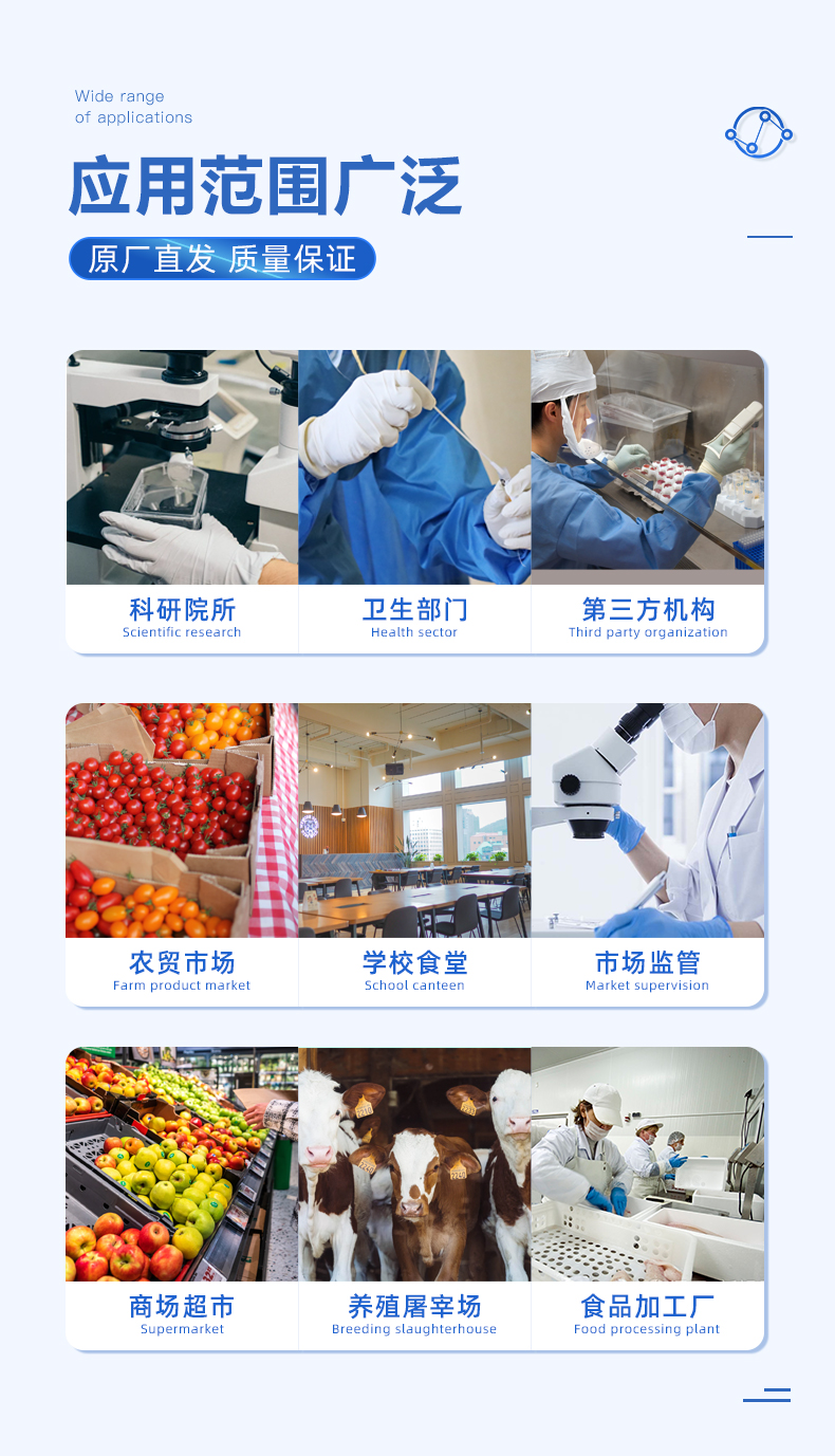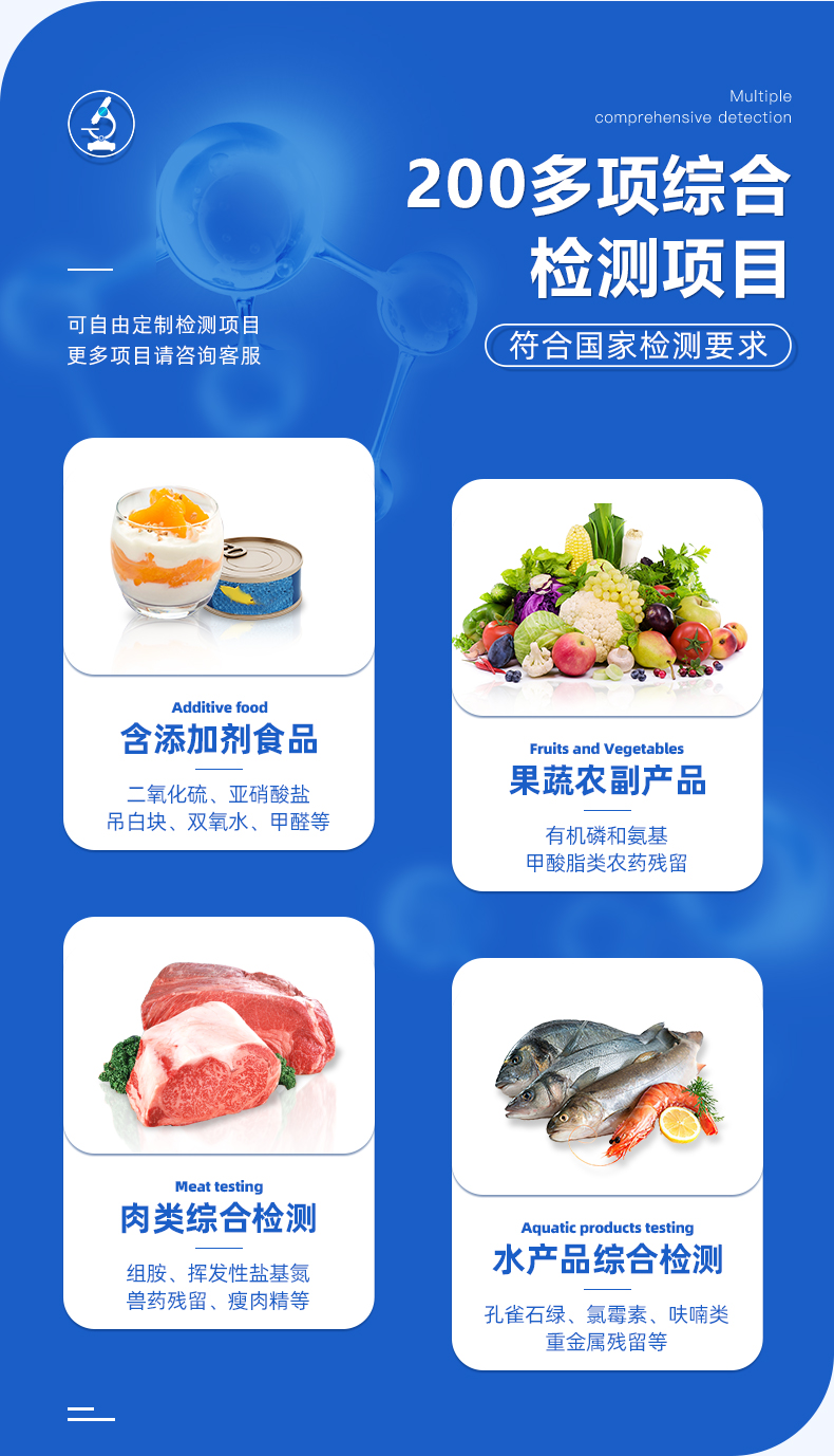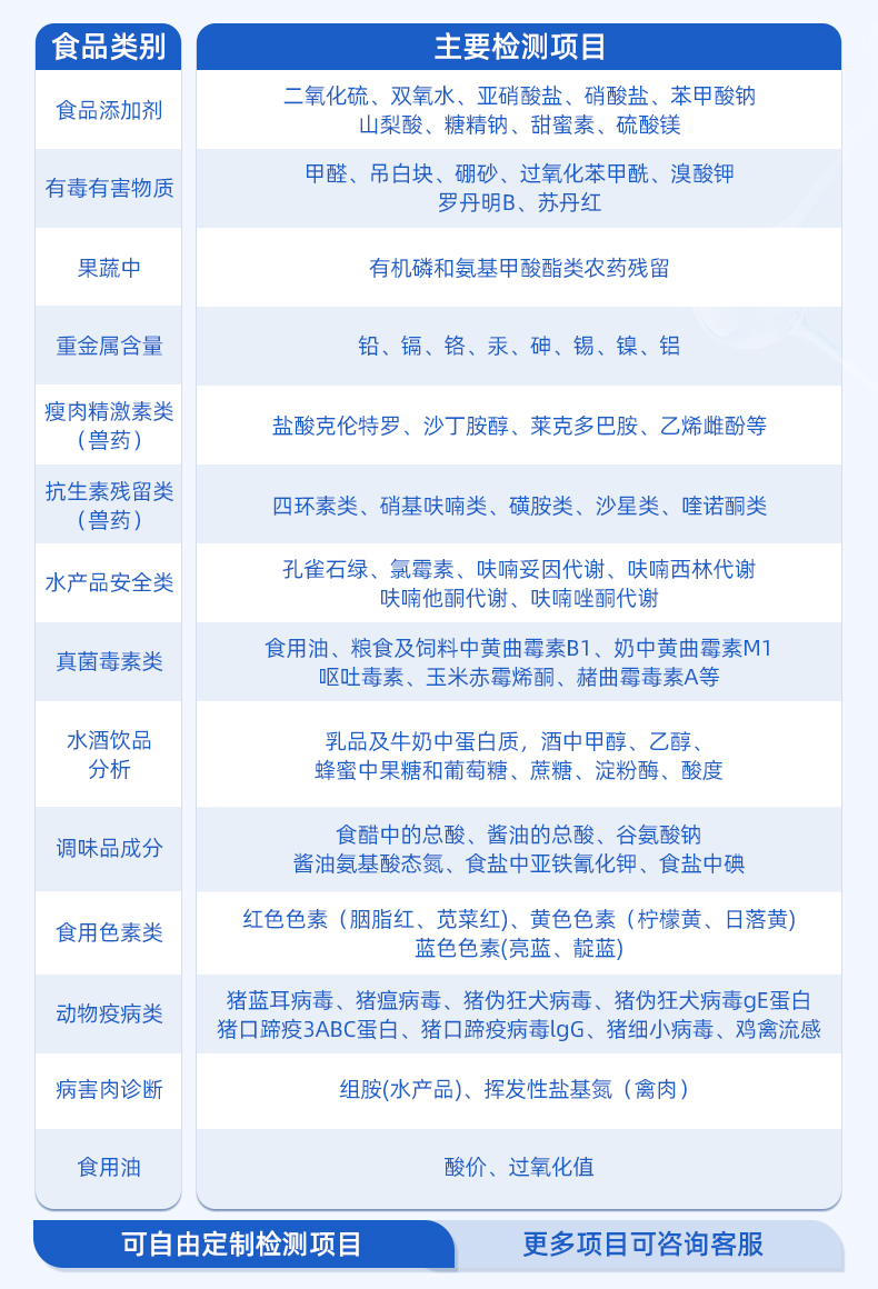 | 食品添加劑:二氧化硫、雙氧水、亞硝酸鹽、硝酸鹽、苯甲酸鈉、山梨酸、糖精鈉、甜蜜素、安賽蜜、硫酸鎂等 | 有毒有害物質(zhì):甲醛、吊白塊、硼砂、過(guò)氧化苯甲酰、溴酸鉀、羅丹明B、三聚氰胺、蘇丹紅等 | 瓜果蔬菜藥殘:農(nóng)藥殘留(酶抑制率法) | 病害肉診斷:組胺、揮發(fā)性鹽基氮、肉制品酸價(jià)、水發(fā)產(chǎn)品中組胺 | 重金屬含量:鉛、鎘、鉻、汞、砷、錫、鎳、鋁等;食用油脂檢測(cè):過(guò)氧化值、酸價(jià)、油脂丙二醛等。 | 食用油脂檢測(cè)::過(guò)氧化值、酸價(jià)等 | 瘦肉精激素類(lèi)(獸藥):鹽酸克倫特羅、沙丁胺醇、萊克多巴胺、己烯雌酚等 | 抗生素殘留類(lèi)(獸藥):四環(huán)素類(lèi)、硝基呋喃類(lèi)、磺胺類(lèi)、β-興奮劑類(lèi)、沙星類(lèi)、磺胺類(lèi)、喹諾酮類(lèi),甲砜霉素,氟苯尼考,金剛烷胺、替米考星、慶大霉素、林可霉素、鏈霉素、恩諾沙星、環(huán)丙沙星、頭孢啦啶、青霉素、阿莫西林等 | 真菌毒素類(lèi):食用油、糧食及飼料中黃曲霉毒素B1、奶中黃曲霉毒素M1、嘔吐毒素、玉米赤霉烯酮、赭曲霉毒素A等 | 水酒飲品分析:乳品及牛奶中蛋白質(zhì);酒中甲醇、乙醇、雜醇油;蜂蜜中果糖和葡萄糖、蔗糖、淀粉酶、酸度;水中氰化物、余氯,飲料中維C等 | 調(diào)味品成分:食醋的總酸、醬油的總酸、芝麻油純度、谷氨酸鈉、醬油氨基酸態(tài)氮、食鹽中亞鐵氰化鉀、食鹽中碘等 | 食用色素類(lèi):紅色色素(胭脂紅、莧菜紅、赤蘚紅、誘惑紅)、黃色色素(檸檬黃、日落黃)、藍(lán)色色素(亮藍(lán))等 | 動(dòng)物疫病類(lèi):豬藍(lán)耳病毒、豬瘟病毒、豬偽狂犬病毒、豬偽狂犬病毒gE蛋白、豬口蹄疫3ABC蛋白、豬口蹄疫病毒IgG、豬細(xì)小病毒、雞禽流感等 | 蜂蜜中:果糖和葡萄糖、蔗糖、淀粉酶、酸度等 | 水產(chǎn)品安全類(lèi):孔雀石綠、氯霉素、呋喃妥因、呋喃西林、呋喃它酮、呋喃唑酮等 |
