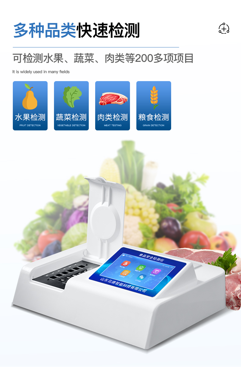 山東云唐智能科技有限公司生產的高智能食品安全檢測儀為集成化食品安全快速檢測分析設備,采用臺式一體化設計,可快速檢測200多種食品安全項目,包含非食用化學物質、濫用食品添加劑、農藥殘留、獸藥殘留、重金屬、病害肉、營養強化劑、抗生素類殘留、激素類殘留、真菌毒素類殘留、化學類殘留等項目的定性定量檢測。該高智能食品安全檢測儀為集成化食品安全快速檢測分析設備,目前已于食藥監局、衛生部門、高教院校、科研院所、農業部門、養殖場、屠宰場、食品肉產品深加工企業及檢驗檢疫部門等單位廣泛使用。