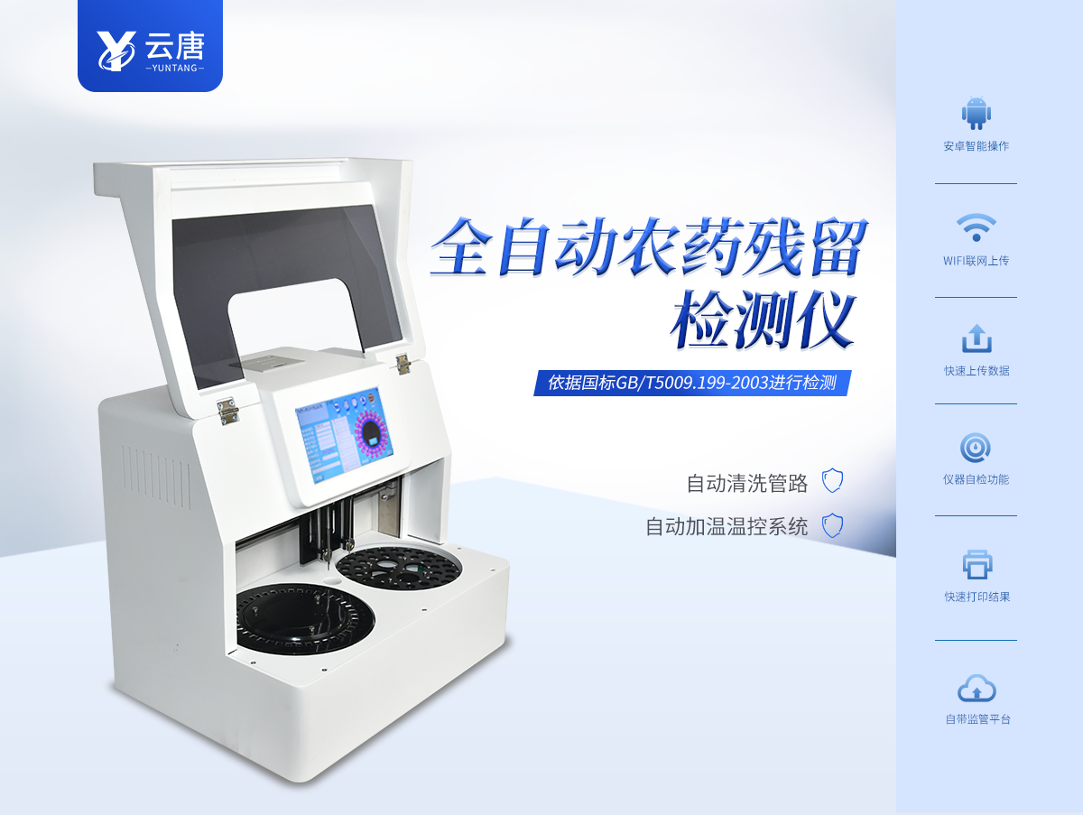 云唐全自動(dòng)農(nóng)藥殘留檢測(cè)儀YT-NY2000,檢測(cè)標(biāo)準(zhǔn):依據(jù)國家標(biāo)準(zhǔn)方法(GB/T5009.199-2003)以及世界衛(wèi)生組織WHO、世界糧農(nóng)組織FAO殘留農(nóng)藥檢測(cè)標(biāo)準(zhǔn)、世界環(huán)境保護(hù)局EPA參照攝入量等要求來設(shè)計(jì)。采用酶抑制率比色法對(duì)水果、蔬菜等農(nóng)林產(chǎn)品中有機(jī)磷和氨基甲酸酯類農(nóng)藥含量進(jìn)行快速準(zhǔn)確的檢測(cè)。