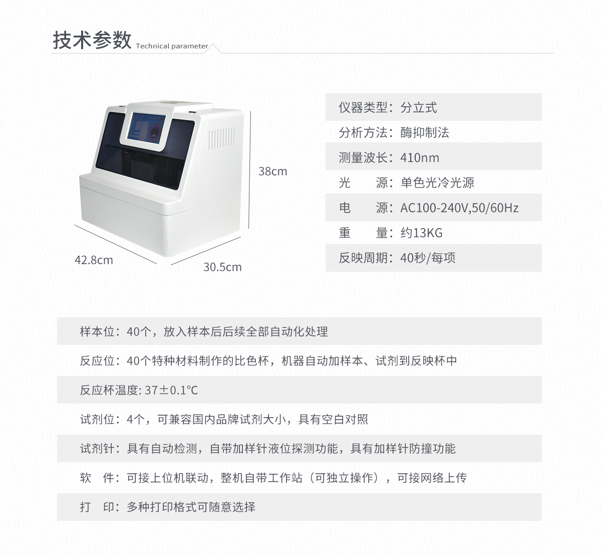 | 波長(zhǎng)配置:   410 | 試 劑 針:   3根 | 檢測(cè)通道:   20個(gè) | 反應(yīng)溫度:   37℃,儀器具有自動(dòng)加溫溫控系統(tǒng) | 觸 摸 屏:   7寸觸摸屏,可單機(jī)操作 | 比 色 皿:   容量 0 - 4.5ml | 試 劑 盒:   配套試劑存放盒,可整體取出 | 清洗功能:   可自動(dòng)清洗試劑管路,避免試劑污染 | 加樣功能:   儀器按照試劑要求自動(dòng)、按時(shí)、按量加入試劑,提高工作效率 | 自動(dòng)混勻:   儀器測(cè)試過程中自動(dòng)震蕩混勻保證試劑充分反應(yīng) | 實(shí)時(shí)監(jiān)控:   儀器測(cè)試過程中顯示實(shí)時(shí)運(yùn)行狀態(tài) | 打印功能:   內(nèi)置熱敏打印機(jī),可快速打印檢測(cè)結(jié)果,方便數(shù)據(jù)留存 | 數(shù)據(jù)存儲(chǔ):   大容量存儲(chǔ)器,能存儲(chǔ)12萬條數(shù)據(jù) | 數(shù)據(jù)接口:   外接USB接口,網(wǎng)線接口 | 網(wǎng)絡(luò)連接:   可連接有線網(wǎng)絡(luò)和無線wifi | 上位機(jī)軟件:   儀器配套電腦端上位機(jī)軟件,可通過軟件進(jìn)行寫入?yún)?shù)及讀取數(shù)據(jù) | 樣本檢測(cè):   儀器自動(dòng)對(duì)未正常放置的樣本或異常的樣本進(jìn)行檢查并報(bào)警提示 | 試劑檢測(cè):   儀器測(cè)試前和測(cè)試過程中時(shí)刻對(duì)試劑進(jìn)行檢查,檢查試劑是否缺失,如有異常儀器會(huì)進(jìn)行報(bào)警提示,對(duì)已經(jīng)加入試劑的樣本進(jìn)行正常測(cè)試,不影響測(cè)試結(jié)果,對(duì)未測(cè)試的樣本停止測(cè)試。 | 數(shù)據(jù)上傳:   儀器數(shù)據(jù)可傳入電腦端,按照客戶需求進(jìn)行保存或打印 | 儀器重量:   約7KG | 儀器尺寸:   410mm*290mm*202mm |