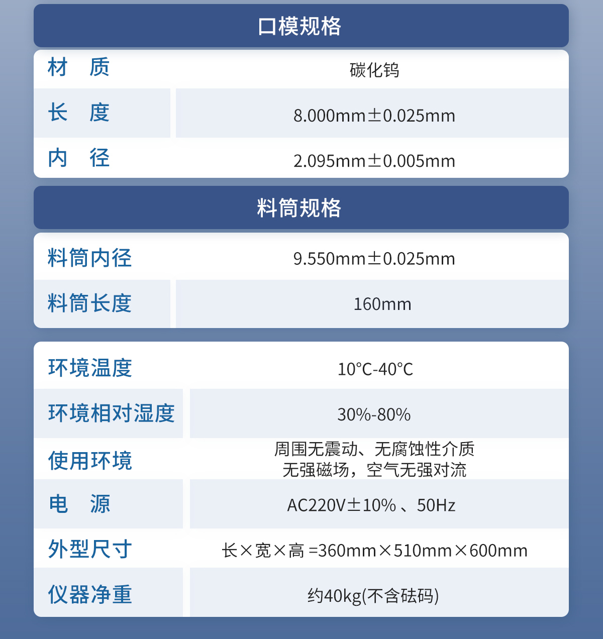 口模:用碳化鎢制成,口模外徑與料筒內徑成間隙配合,口模內徑有2.095±0.005mm和1.180±0.010mm兩種,內壁光潔度不低于0.2um,高度皆為8.00±0.025mm。