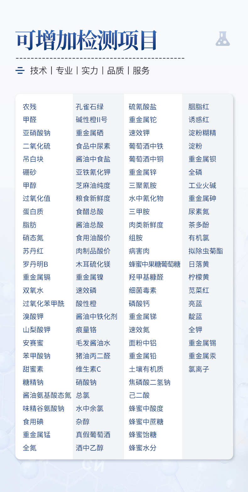7、具有多個食品安全檢測項(xiàng)目,開放平臺,可以增減檢測項(xiàng)目。