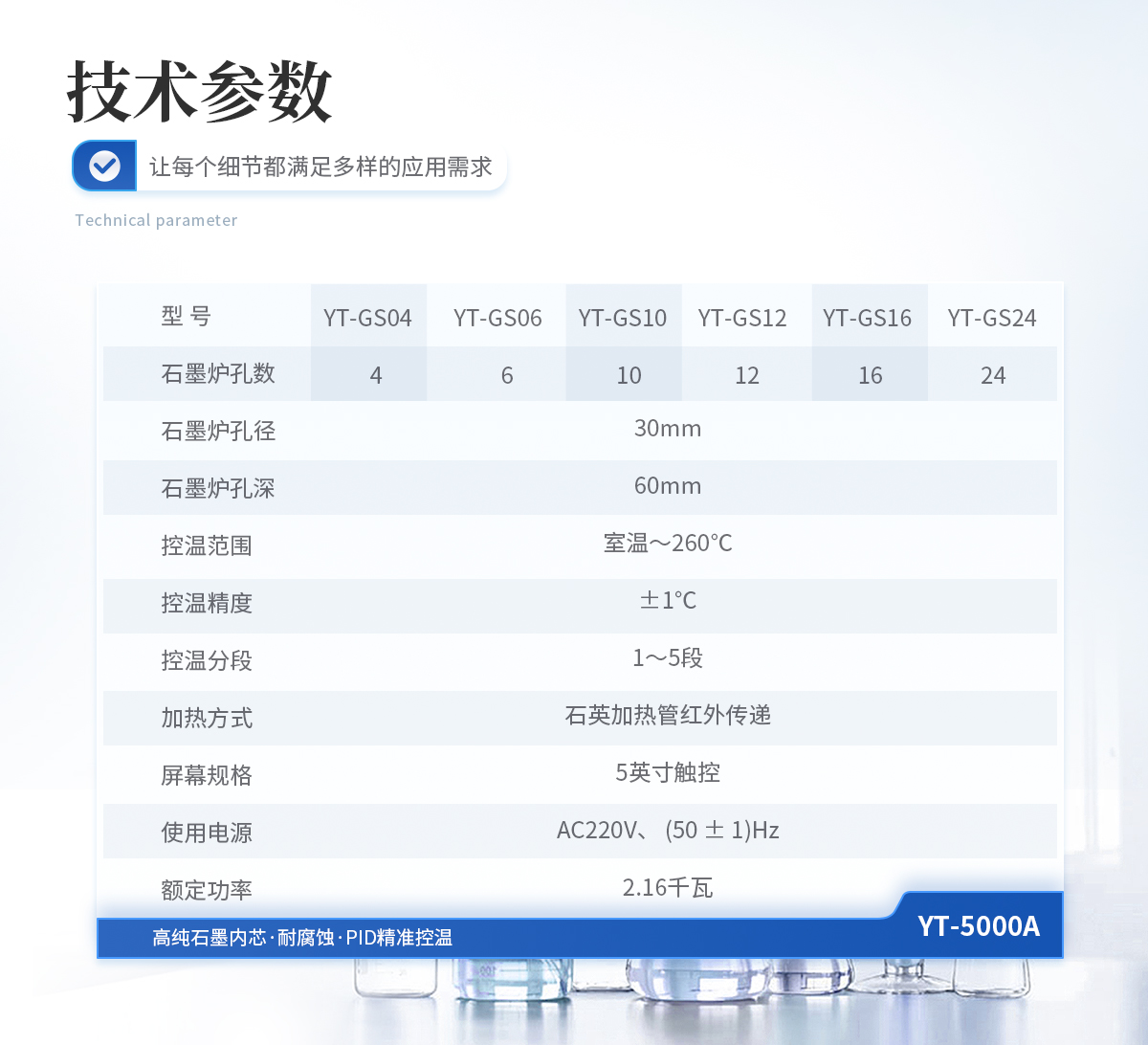 | 石墨爐孔:孔徑30mm,孔深60mm,孔數(shù)5×2 | 控溫范圍:室溫~260℃ | 控溫精度:±1℃ | 控溫分段:1~5段 | 加熱方式:石英加熱管紅外傳遞 | 屏幕規(guī)格:5寸觸控 | 主機(jī)外型尺寸:寬522mm×深371mm×高168mm | 使用電源:AC220V、 (50 ± 1)Hz | 額定功率:1.6千瓦 |