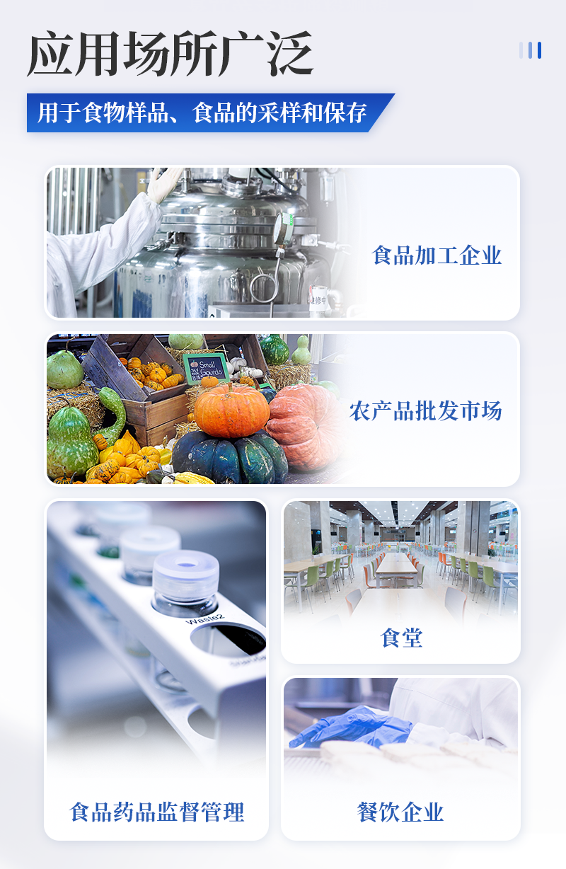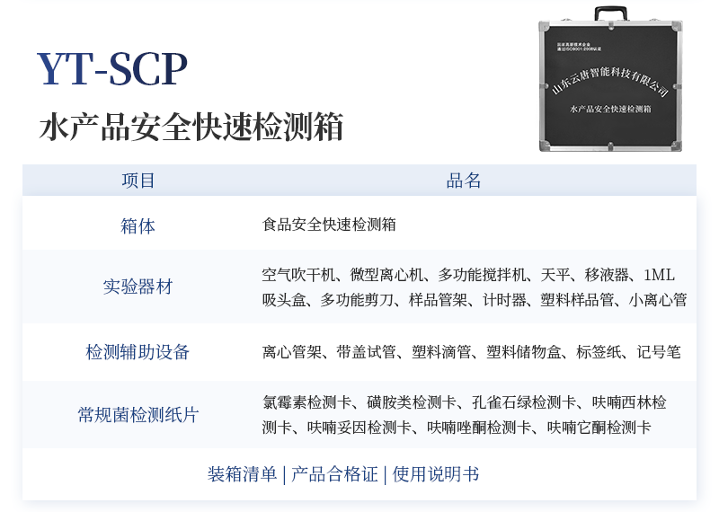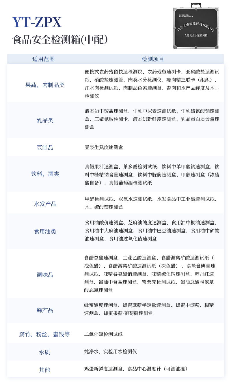 急性中毒快速檢測箱標配箱 序號 適用范圍 檢測項目 規格 單位 數量 檢測限 檢測范圍 1 果蔬、肉制品類 便攜式農藥殘留快速檢測儀 12通道 臺 1 / / 農藥殘留速測卡 20次 盒 3 0.3-3.5mg/kg / 亞硝酸鹽速測試紙 20條 套 1 2mg/kg 0-40mg/kg 砷速測盒 30次 盒 1 砷:2mg/kg / 汞速測盒 30次 盒 1 汞:20mg/kg / 瘦肉精三聯卡(組織) 各10次 包 2 鹽酸克倫克羅、萊克多巴胺3ppb,沙丁胺醇5ppb / 2 豆制品 奶制品 液態奶新鮮度速測盒 20次 盒 1 0.60T / 豆漿生熟度速測盒 50次 盒 1 定性 / 3 飲料、酒類 甲醇速測盒(濃硫酸自備) 25次 盒 1 0.02g/100mL 0-0.32g/100mL 4 糧食、干果 黃曲霉毒素B1檢測卡 10次 包 1 0.5ppb / 5 食用油類 食用油酸價速測盒 100次 盒 1 1mg/kg 0-8mg/kg 食用油過氧化值速測盒 100次 盒 1 0.09g/100g 0.09-0.45g/100g 6 食物及水 中毒物殘留 毒鼠強速測盒(乙酸乙酯自備) 10次 盒 1 2mg/kg / 敵鼠鈉鹽速測盒 100次 盒 1 100mg/kg / 氰化物檢測試紙 20條 套 1 1mg/L 0-10mg/L 氟乙酰胺速測盒 30次 盒 1 50mg/kg / 硼酸和硼砂速測盒 100次 盒 1 25mg/kg 定性 鼠藥安妥檢測試紙 40次 包 1 0.02mg/g,mL / 鼠藥磷化鋅速測盒 10次 包 1 20mg/kg / 7 箱體預裝輔助設備 急性中毒箱箱體 便攜式 個 1 / / 便攜水浴鍋 功率300W 個 1 多功能剪刀 - 把 1 計算器 - 個 1 洗瓶 250ml 個 1 塑料滴管 3ml 根 10 塑料滴管 0.2ml 根 50 樣品管架 10ml 個 1 天平 0.1-200g 個 1 移液器 1mL 支 1 玻璃三角瓶 100ml 個 2 玻璃樣品管 10ml 個 2 小離心管 1.5ml 個 24 塑料樣品管 10ml 個 10 樣品瓶 50ml 個 2 離心管架 1.5ml 個 1 燒杯 250ml 個 1 量筒 100ml 個 1 手套 - 包 1 計時器 - 個 1 槍頭 1ml 個 20 組織提取器 便攜式 個 1 錫箔紙 10張/包 包 1 裝箱清單 - 份 1 產品合格證 - 份 1 使用說明書 - 份 1 |