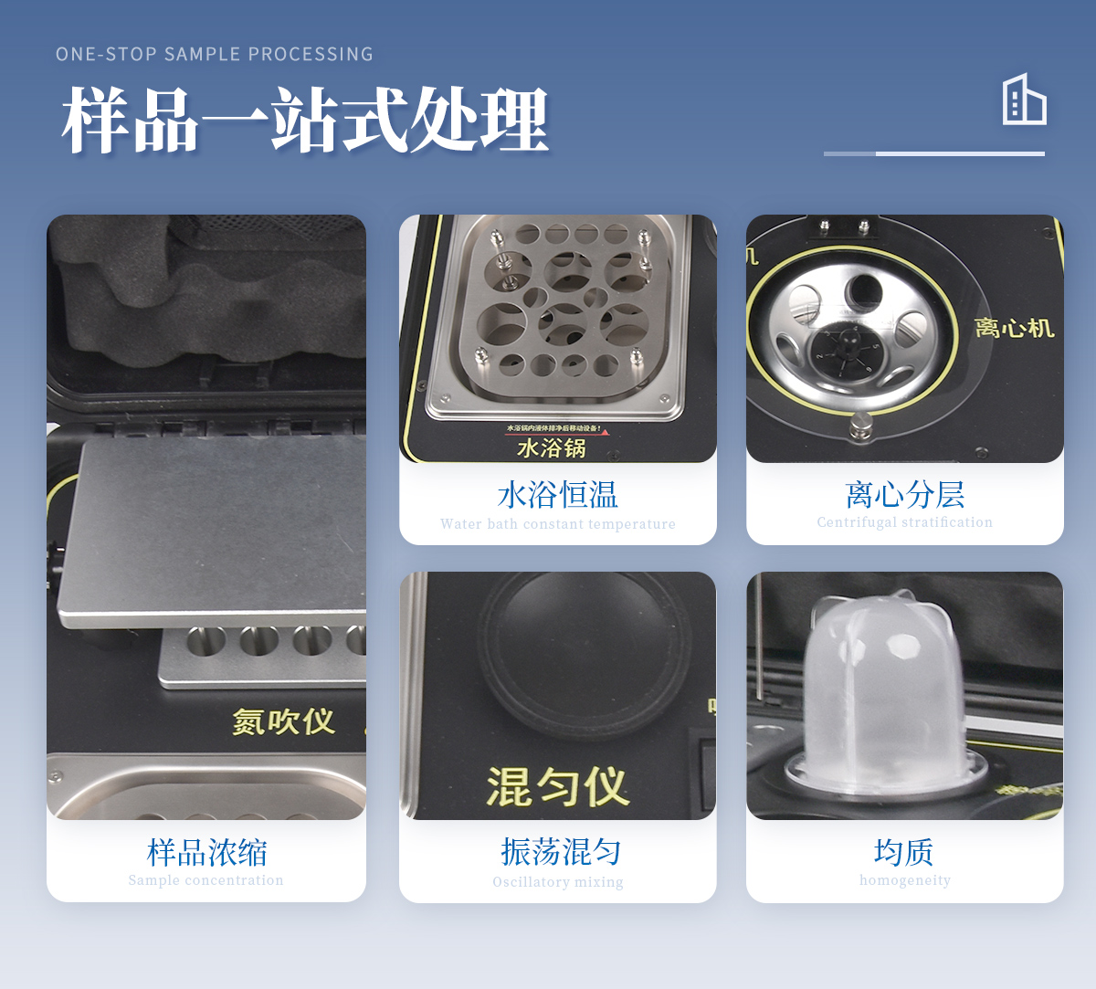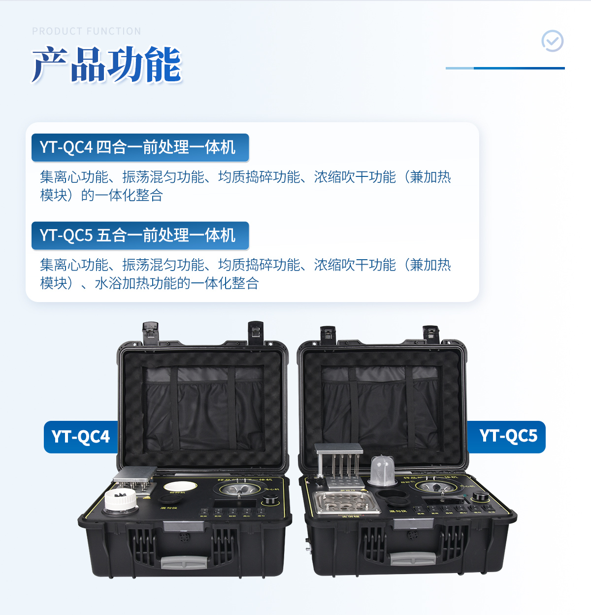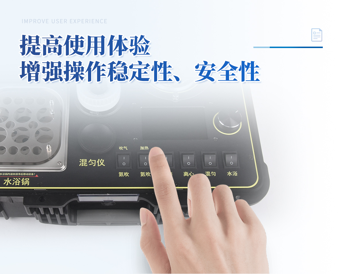 | 1、功能緊湊,集成四種樣品前處理常用的功能,完成樣品一站式處理。 | 2、結構穩固,機箱采用***工程塑料,具備**的抗沖擊性、耐腐蝕性、便攜性。 | 3、操作穩定,機器采用五寸全彩色液晶屏,功能指示性強,用戶操作均為實體開關,杜絕佩戴手套和液體噴濺時的操作失效。 |