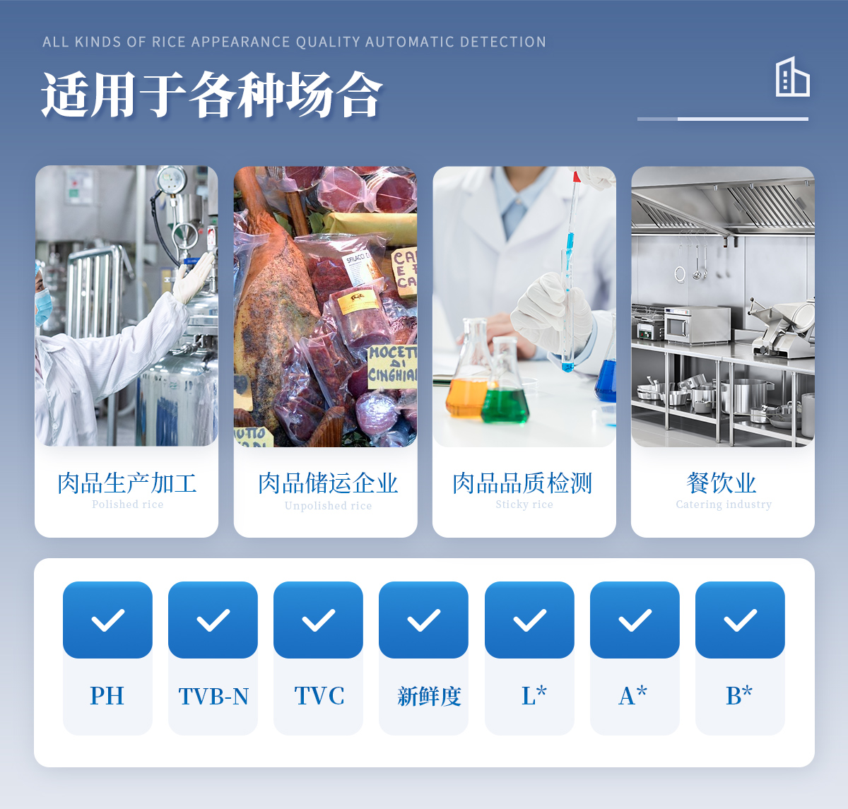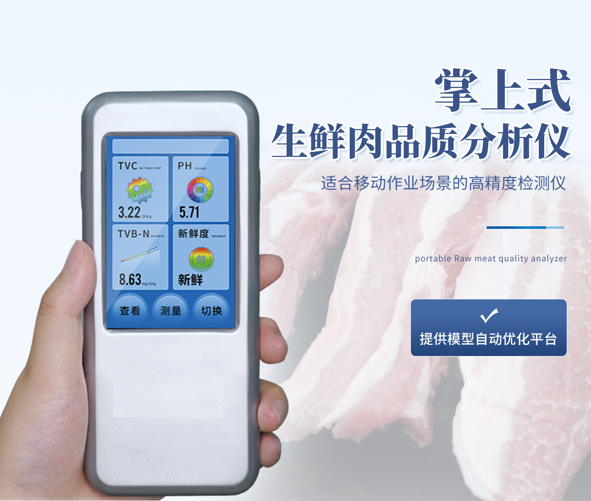聯(lián)合中國農(nóng)業(yè)大學(xué)彭彥昆教授團(tuán)隊(duì)研發(fā)的掌上式生鮮肉新鮮度分析儀,可用于檢測生鮮肉的TVC、pH、TVB-N、新鮮度、L*、A*、B*等評價(jià)指標(biāo)。Palmarter具有體積小、便 于攜帶、性價(jià)比高等特點(diǎn),其應(yīng)用場景包括但不限于肉儲運(yùn)企業(yè)、肉品品質(zhì)監(jiān)管部門、飯店、超市、菜場、家庭等。