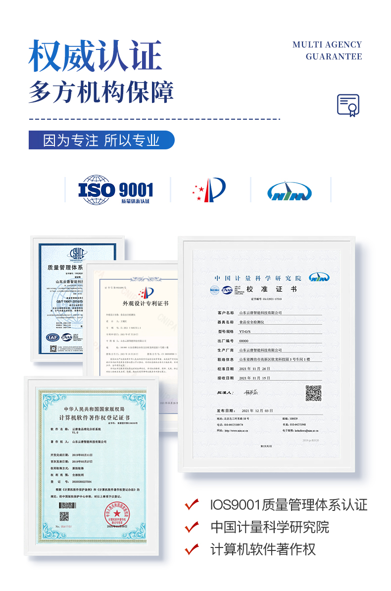 | 1、安卓智能操作系統,采用更加**和人性化操作,儀器具有wifi聯網上傳、4G聯網傳輸、GPRS無線遠傳、網線連接功能,快速上傳數據。 | 2、智能化程度高,儀器具有自檢功能:具有開機自檢和調零功能,具有自動檢測重復性功能。 | 3、新一代高速熱敏打印機,檢測完成可自動打印檢測報告和二維碼。 | 4、儀器帶有監管平臺,數據可局域網和互聯網數據上傳,檢測結果直接傳至食品安全監管平臺。進行區域食品安全監管及大數據分析處理與數據統計,檢測區域食品安全長短期動態,達到食品安全問題預估、預警 | 5、一體化便攜式快檢設備,滿足現場及流動檢測使用需求,能夠在同一軟件下實現所有檢測項目的檢測,并可通過同一窗口直觀顯示檢測結果。 | 6、膠體金模塊檢測方式:軌道式自動傳輸掃描,檢測完成后自動退出檢測卡。 | 7、儀器內置攝像頭拍照,可顯示金標卡實時圖像,系統自動分析并呈現出CT曲線圖,CT線自動識別,無需手動調整。 | 8、儀器具有品類多種類樣品菜單庫,可靈活選擇檢測樣品,不同的檢測通道可同時檢測不同的樣品項目。 | 9、樣品處理簡單省力,整體操作快速、安全、便捷。 | 10、高靈敏度,高檢測精度,高重復性精度,掃描式高精度光學傳感器。 | 11、內置強大的數據庫,可在儀器上直接選擇樣品名稱、檢測指標、送檢單位等信息,也可在儀器上直接編輯錄入樣品名稱、檢測指標、送檢單位等信息并保存進樣品數據庫。 | 12、儀器具有自身保護功能,可設置用戶名及密碼,防止非工作人員操作等。 | 13、儀器具有重新校準、鎖定、恢復出廠設置功能。 | 14、結果判定線可修改,對照值標定值可保存,斷電不丟失數據。 | 15、兼容市場上所有的膠體金卡,使用耗材不受限制,極大增強用戶使用體驗。 |