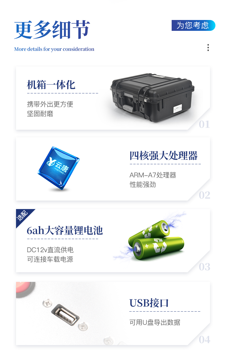 | 1、主控芯片采用ARM Cortex-A7,RK3288/4核處理器,主頻1.88Ghz,運轉速度更快速,穩定性更強。 | 2、顯示方式:7英寸液晶觸摸屏顯示,人性化中文操作界面,讀數直觀、簡單。 | 3、交直流兩用,直流12V供電,可連接車載電源,可配6ah大容量充電鋰電池,方便戶外流動測試。 | 4、光源亮度自動調節與校準 | 5、智能恒流穩壓,光強自動校準,長時間連續工作光源無溫漂現象。。 | 6、內置新國家限量標準,與所測結果進行現場比對,并持續更新標準。內置新國家限量標準,與所測結果進行現場比對,并持續更新標準。 | 6、內置新國家限量標準,與所測結果進行現場比對,并持續更新標準。 | 7、不間斷進樣,連續檢測 | 檢測項目可擴充。 | 8、樣本編號自動累加。 | 9、檢測項目可擴充。 | 10、檢測結果可批量打印,批量上傳。 | 11、檢測結果為Excel表格,連接電腦即可拷貝。 | 12、檢測結果存儲容量20萬條 | 13、支持U盤存儲,標準USB接口,免驅動安裝。 | 14、固件可升級 |
