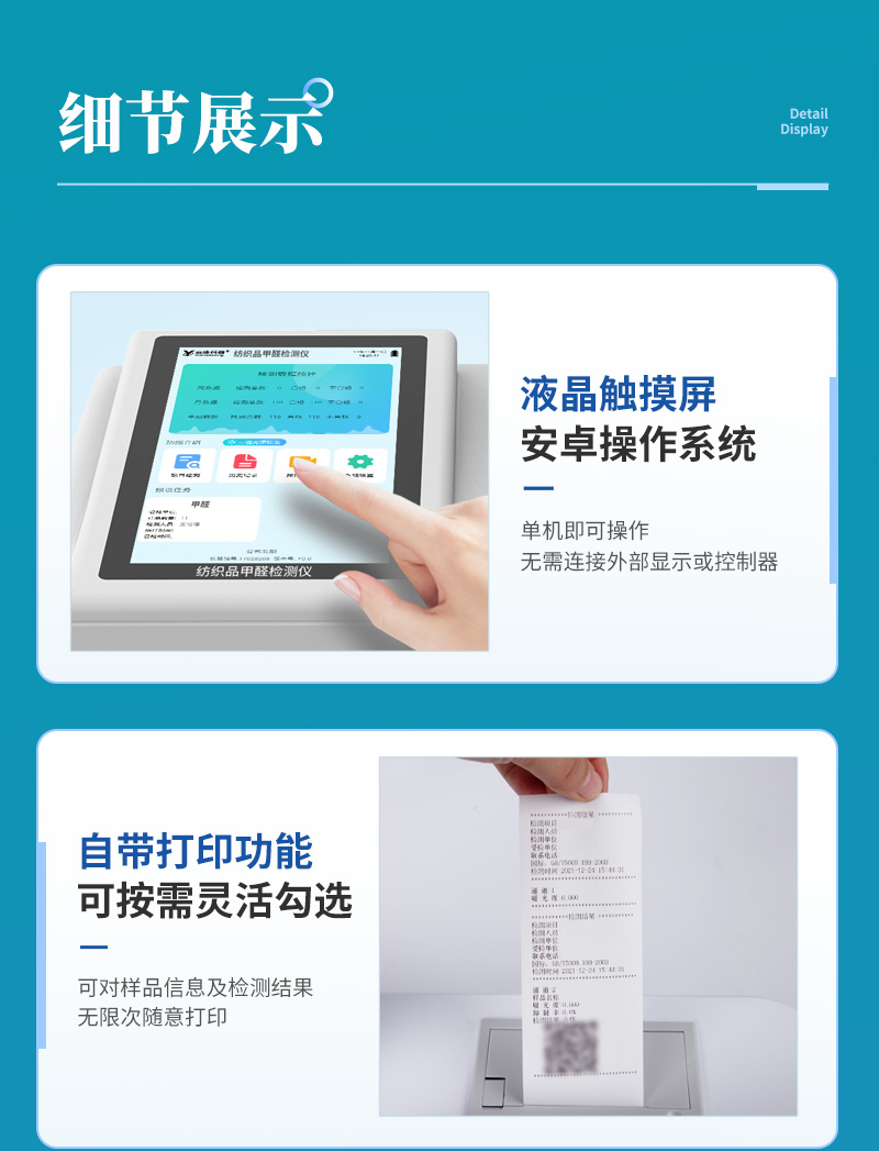 該紡織品甲醛檢測設備滿足紡織品甲醛含量檢測的中國標準《國家紡織產品基本安全技術規范》(GB 18401-2010)、《紡織品.甲醛的測定.第1部分:游離和水解的甲醛(水萃取法)》(GB/T 2912.1-2009), 適合各種紡織品、服裝等的甲醛含量檢測。