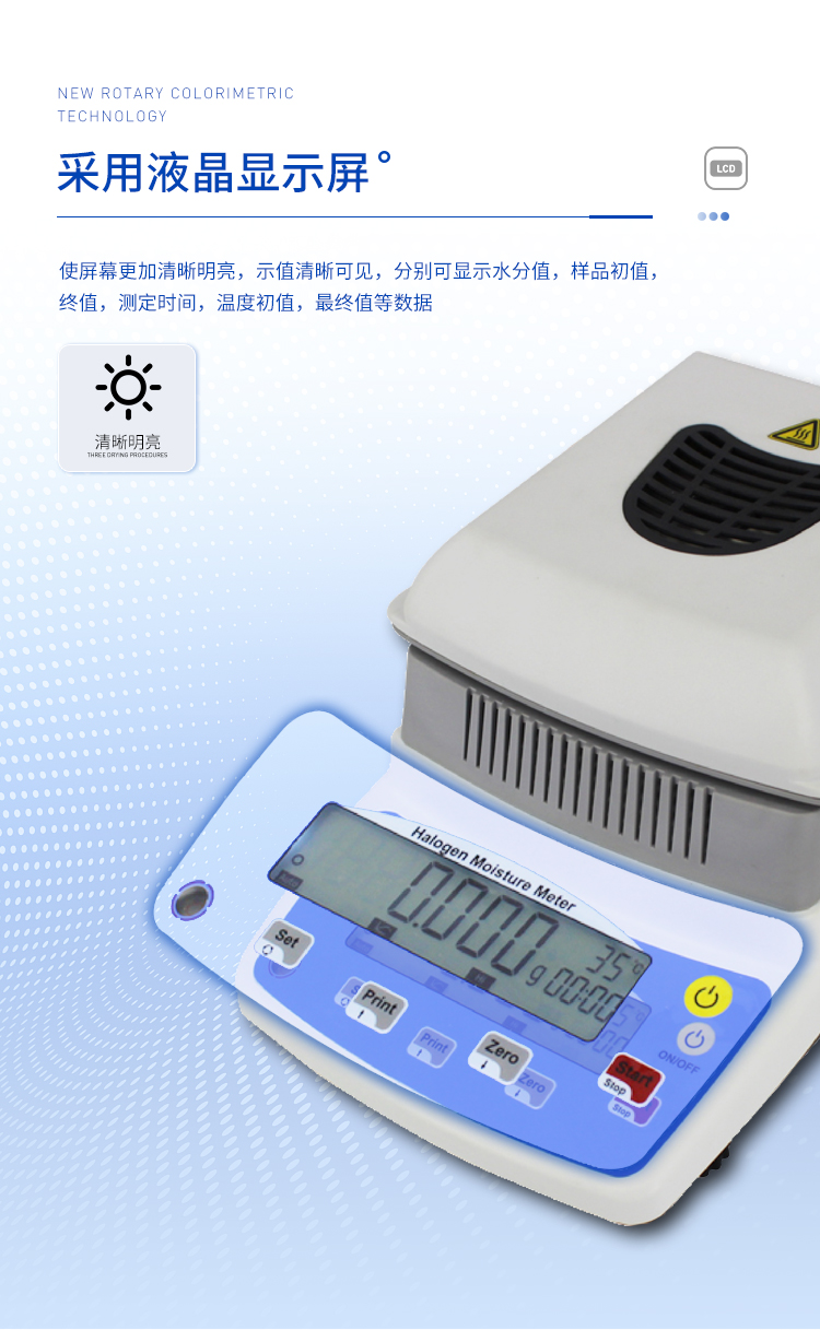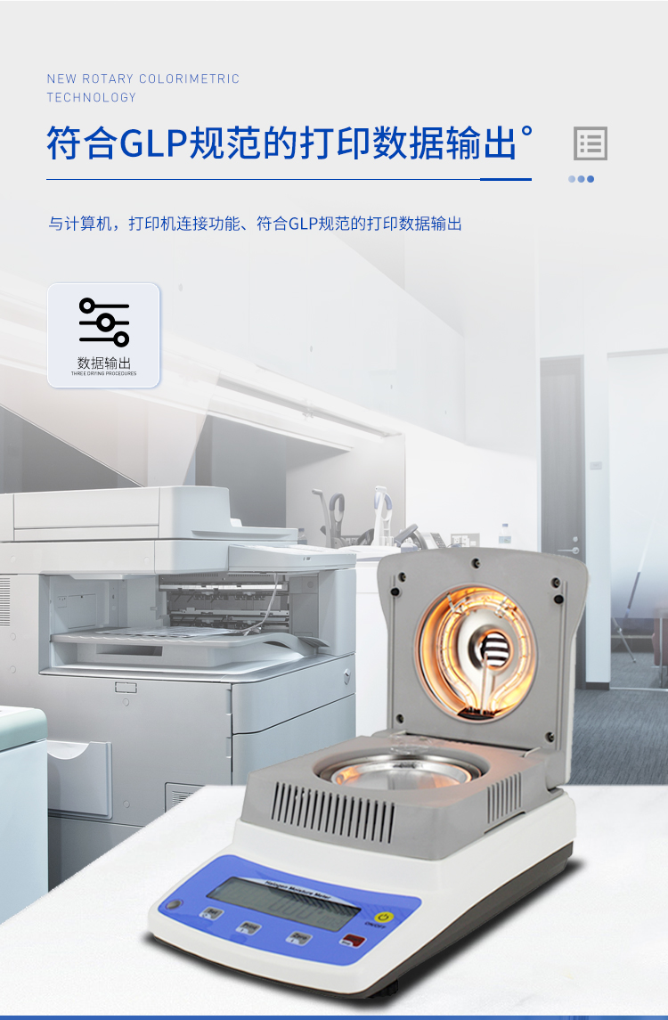 環狀的鹵素燈確保樣品得到均勻加熱,操作簡便、測量準確。鹵素水分測定儀在測量樣品重量的同時,儀器采用環形管鹵素加熱方式,快速干燥樣品,在干燥過程中,水分儀持續測量并即時顯示樣品丟失的水分含量%,干燥程序完成后,*終測定的水分含量值被鎖定顯示。與國際烘箱加熱法相比,鹵素加熱可以在高溫下將樣品均勻地快速干燥,樣品表面不易受損,其檢測結果與國標烘箱法具有良好的一致性,具有可替代性,且檢測效率遠遠高于烘箱法。智能化操作,一般樣品只需幾分鐘即可完成測定。該儀器操作簡單,測試準確,顯示部分采用液晶顯示屏-使屏幕更加清晰明亮,示值清晰可見,分別可顯示水分值,樣品初值,終值,測定時間,溫度初值,*終值等數據,并具有與計算機,打印機連接功能、符合GLP規范的打印數據輸出。