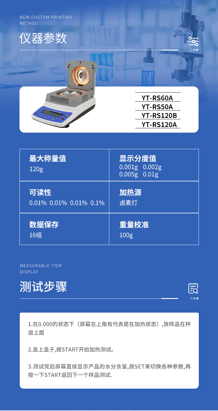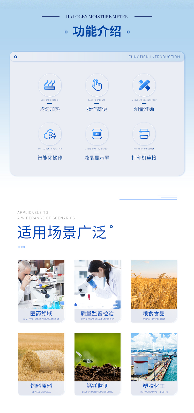 可廣泛應用于一切需要快速測定水分的行業,如醫藥,糧食、飼料、種子,菜籽,脫水蔬菜、煙草,化工,茶葉,食品、肉類以及紡織,農林、造紙、橡膠、塑膠、紡織等行業中的實驗室與生產過程中。同時滿足固體、顆粒、粉末、膠狀體及液體含水率的測定要求