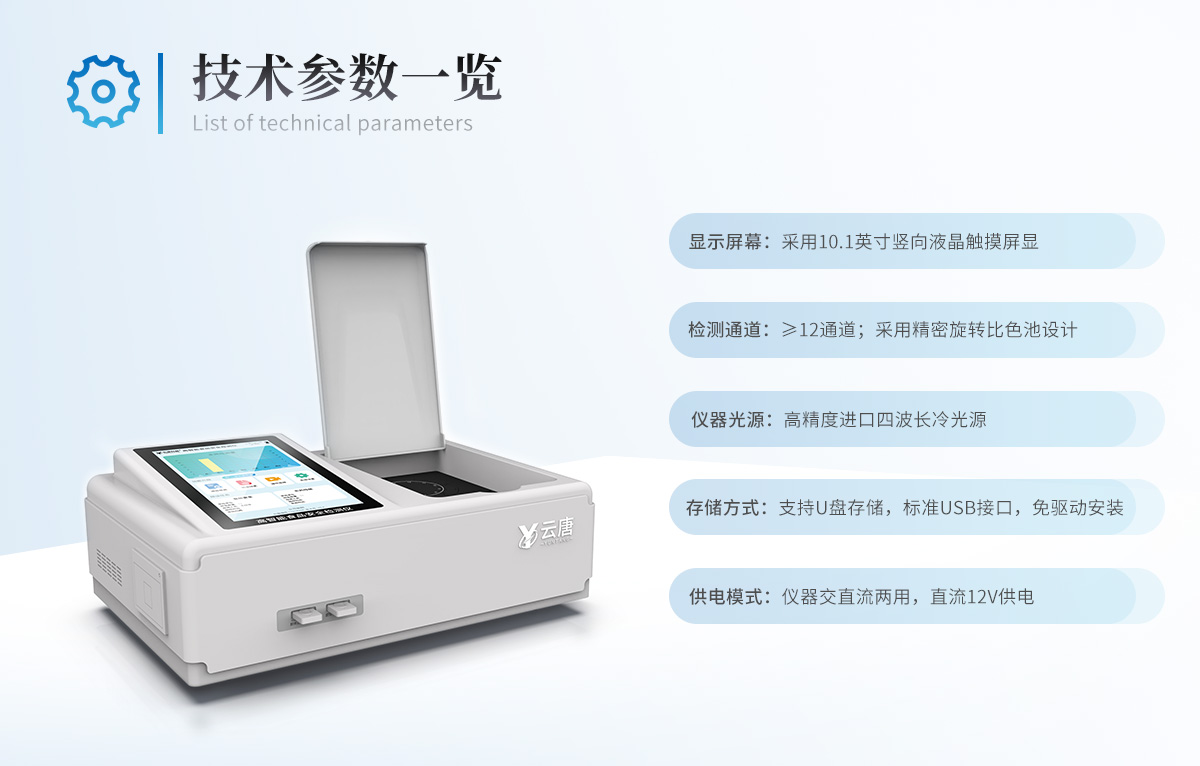 | 儀器采用臺式一體化系統檢測技術,將分光光度模塊、膠體金檢測模塊、新型農殘檢測模塊、數字化管理模塊、無線通訊模塊高度集成于一體,支持檢測200種食品安全檢測項目,同時預留升級檢測方法。 | 儀器檢測模塊標準化、智能化,可隨意自由組合。檢測箱體內置多個標準檢測單元,檢測模塊可以調整配置。 | 儀器采用全新安卓智能系統,主控芯片采用 ARM Cortex-A7,RK3288/4核處理器,10.1寸高清液晶觸摸豎屏,更加**的UI交互界面,運轉快捷;儀器配備無線通信模塊: 4G(APN)通訊模塊、Wifi模塊,藍牙傳輸,同時具有雙USB接口以及RJ45接口能以多種方式實現數據保存和數據傳輸功能。 | 創新檢測模式★檢測通道:≥12通道;采用精密旋轉比色池設計,使用同芯片同光源校準精度,解決不同光源之間的誤差值。1-12通道間誤差0.1%。(***:**202022821055.2) ★儀器具有自動識別比色皿檢測功能,即:將樣品比色皿放入儀器后,點擊樣品檢測,儀器自動識別比色皿進行通道檢測。 | 進口高精光源:高精度進口四波長冷光源,通道配置 410、520、590、630nm 波長光源,一個光源芯片驅動一個光源,誤差極小,每臺設備單獨**校準光源,**比對,同時參照四種不同波段光源全方位覆蓋市面上99%的農殘食品項目檢測。 | 膠體金模塊檢測方式:★采用COMS實時成像技術,可采集多個畫面,支持2個金標同時讀卡,通過不同顏色的灰度變化,一秒精準得出結果。 | 智能操作分析系統: | ★便捷操作系統:設備檢測時可在同一檢測界面自動對應相關檢測通道一次性選擇1-12個樣品名稱,無須退出界面,節省操作時間。(需提供對應證明) | ★數據集成系統:設備首頁自動統計檢測數據包含:周檢測數據、月檢測數據,全部檢測總數量,均包含檢測總數,合格數,不合格數,以及相關柱形分析圖,對各項檢測數據清晰掌握,無需電腦查詢,更加快捷直觀。(需提供對應證明文件) | ★項目預設系統:支持添加單個及多個相同或不相同的任務預設,一鍵快速調取,每一個任務分別可以設置不同的樣品、批次、編號、來源、備注、抽樣信息、檢測信息、受檢信息、復核信息等更多信息。無縫鏈接平臺和APP實時查看下發任務。(需提供對應證明文件) | ★數據監管系統:同步對接監管平臺,數據可局域網和互聯網數據上傳,檢測結果可選擇直接傳至食品安全監管平臺。集成OSS輸出存儲服務、區分設備定向管理應用,進行區域食品安全監管及大數據分析處理與數據統計,檢測區域食品安全長短期動態,達到食品安全問題預估、預警。(需提供對應食品理化分析系統計算機軟件著作權)。 | ★ 自定義打印系統:內置全新打印系統,新創自定義打印方式,可按需靈活設置開啟或關閉:產品合格證(國家農業部標準要求),二維碼,抽樣信息、檢測信息,受檢信息、復核信息、抽樣日期、檢測日期等信息的打印。(需提供對應證明) | ★系統遠程更新功能:可定向分客戶分儀器更新系統,按照不同客戶后期實際需求添加項目,無需機器返廠,即可遠程實時升級全新系統,節省時間成本及避免運輸造成設備損壞。 | 儀器主機采用一體化防水、抗壓、防撞擊、防腐蝕箱體設計,同時配備交直流供電,可連接車載電源,可選配大容量充電鋰電池,滿足現場野外檢測需求。 | 安全證書,放心保障:儀器具有中國計量科學研究院校準證書,權威認證。 |