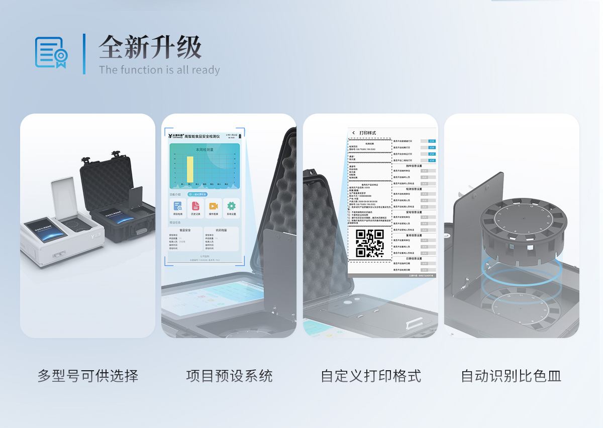 | 儀器采用手提式一體化系統(tǒng)檢測(cè)技術(shù),將分光光度模塊、膠體金檢測(cè)模塊、新型農(nóng)殘檢測(cè)模塊、數(shù)字化管理模塊、無(wú)線通訊模塊高度集成于一體,支持檢測(cè)200種食品安全檢測(cè)項(xiàng)目,同時(shí)預(yù)留升級(jí)檢測(cè)方法。 | 儀器檢測(cè)模塊標(biāo)準(zhǔn)化、智能化,檢測(cè)項(xiàng)目可隨意自由組合。檢測(cè)箱體內(nèi)置多個(gè)標(biāo)準(zhǔn)檢測(cè)單元,檢測(cè)模塊可以調(diào)整配置。 | 顯示屏幕:儀器采用10.1英寸豎向液晶觸摸屏顯,搭配運(yùn)行安卓智能操作系統(tǒng),主控芯片采用ARM Cortex-A7,RK3288/4核處理器,主頻1.88Ghz,操作方便,性能更強(qiáng)。 | 檢測(cè)通道:≥12通道;采用精密旋轉(zhuǎn)比色池設(shè)計(jì),使用同芯片同光源校準(zhǔn)精度,解決不同光源之間的誤差值,更加準(zhǔn)確**。(1-12通道間誤差0.1%,***:**202022821055.2) | 儀器光源:高精度進(jìn)口四波長(zhǎng)冷光源,每個(gè)通道均配置 410、520、590、630nm 波長(zhǎng)光源,標(biāo)配**的光路切換裝置,專利光路切換功能可實(shí)現(xiàn)64波長(zhǎng),并且所有檢測(cè)項(xiàng)目可實(shí)現(xiàn)所有通道同時(shí)檢測(cè)。 | 設(shè)備可一鍵校準(zhǔn),自動(dòng)保存校準(zhǔn)數(shù)據(jù),自動(dòng)對(duì)比校驗(yàn),得到精準(zhǔn)光源,采用Android SP存儲(chǔ)數(shù)據(jù),光源數(shù)據(jù)永不丟失,方便每一次使用。 | 通訊接口:配備無(wú)線通信模塊、4G(APN)通訊模塊、藍(lán)牙傳輸,同時(shí)具有雙USB接口以及RJ45網(wǎng)線接口,可以多方式實(shí)現(xiàn)數(shù)據(jù)保存及數(shù)據(jù)傳輸。 | 存儲(chǔ)方式:支持U盤存儲(chǔ),標(biāo)準(zhǔn)USB接口,免驅(qū)動(dòng)安裝。檢測(cè)結(jié)果存儲(chǔ)容量20萬(wàn)條以上,可生成Excel表格進(jìn)行拷貝,并具有登錄保護(hù)功能。 | 智能化操作系統(tǒng):: ★操作系統(tǒng):儀器可在同一檢測(cè)界面自動(dòng)對(duì)應(yīng)相關(guān)檢測(cè)通道,一次性選擇1-12個(gè)樣品名稱,無(wú)需退出界面,節(jié)省操作時(shí)間。并可以對(duì)每個(gè)通道屬性和樣品信息單獨(dú)進(jìn)行編輯,例如送檢單位、人員,檢測(cè)人員等,打印時(shí)勾選打印顯示。 | ★數(shù)據(jù)集成系統(tǒng):設(shè)備首頁(yè)自動(dòng)匯總分析檢測(cè)數(shù)據(jù),包含:周檢測(cè)數(shù)據(jù)、月檢測(cè)數(shù)據(jù),全部檢測(cè)總數(shù)量,均包含檢測(cè)總數(shù),合格數(shù),不合格數(shù),以及相關(guān)柱形分析圖,各項(xiàng)檢測(cè)數(shù)據(jù)一目了然,無(wú)需電腦查詢,更加快捷直觀。 | ★數(shù)據(jù)庫(kù)系統(tǒng):十幾項(xiàng)數(shù)據(jù)庫(kù)分類管理儀器:包含項(xiàng)目類型、項(xiàng)目數(shù)據(jù)、檢測(cè)數(shù)據(jù)、歷史記錄、國(guó)標(biāo)信息、曲線信息、采樣信息、檢測(cè)信息、受檢信息、復(fù)核信息、圖表信息、光源校準(zhǔn)信息、打印樣式信息、樣品庫(kù)信息等等,數(shù)據(jù)庫(kù)之間互相協(xié)調(diào)聯(lián)動(dòng)保證數(shù)據(jù)的真實(shí)完整性。同時(shí)產(chǎn)品數(shù)據(jù)庫(kù)以及歷史檢測(cè)記錄支持一鍵檢索功能。 | ★限量規(guī)判系統(tǒng):具有限量查詢、添加物質(zhì)合規(guī)判定系統(tǒng)。檢測(cè)出結(jié)果后,系統(tǒng)自動(dòng)調(diào)用系統(tǒng)數(shù)據(jù)庫(kù)中相關(guān)國(guó)標(biāo)進(jìn)行比對(duì)判定,客觀顯示判定結(jié)果是否合格 | ★項(xiàng)目預(yù)設(shè)系統(tǒng):儀器具有任務(wù)預(yù)設(shè)模塊,一鍵提前預(yù)設(shè),給出方便快捷的新檢測(cè)方案,每一個(gè)任務(wù)分別可以設(shè)置不同的樣品、批次、編號(hào)、來源、備注、抽樣信息、檢測(cè)信息、受檢信息、復(fù)核信息等更多信息。樣品送檢時(shí)一鍵調(diào)取保存信息,并可多次調(diào)取,大大提高檢測(cè)效率。 | ★數(shù)據(jù)監(jiān)管系統(tǒng):同步對(duì)接監(jiān)管平臺(tái),數(shù)據(jù)可局域網(wǎng)和互聯(lián)網(wǎng)數(shù)據(jù)上傳,檢測(cè)結(jié)果可選擇直接傳至食品安全監(jiān)管平臺(tái)。進(jìn)行區(qū)域食品安全監(jiān)管及大數(shù)據(jù)分析處理與數(shù)據(jù)統(tǒng)計(jì),檢測(cè)區(qū)域食品安全長(zhǎng)短期動(dòng)態(tài),達(dá)到食品安全問題預(yù)估、預(yù)警。 | ★打印系統(tǒng):內(nèi)置全新打印機(jī),新創(chuàng)自定義打印方式,可按需靈活勾選控制:產(chǎn)品合格證(國(guó)家農(nóng)業(yè)部標(biāo)準(zhǔn)要求),二維碼,抽樣信息、檢測(cè)信息,受檢信息、復(fù)核信息、抽樣日期、檢測(cè)日期等信息的打印。 | 供電模式:儀器交直流兩用,直流12V供電,可連接車載電源,可配6ah大容量充電鋰電池,電量可實(shí)時(shí)顯示,方便戶外流動(dòng)測(cè)試。 | 膠體金檢測(cè)模塊:采用雙通道CMOS成像處理技術(shù)及膠體金免疫層析技術(shù),可同時(shí)讀取雙膠體金卡數(shù)據(jù),自動(dòng)采集、處理分析,將檢測(cè)結(jié)果顯示,并可根據(jù)參考限值自動(dòng)判斷檢測(cè)結(jié)果,可檢測(cè)常見的獸藥殘留、生物毒素、抗生素、違禁添加物等。 | ★探測(cè)技術(shù):CMOS成像探測(cè); | ★檢測(cè)通道:1個(gè)通道; | ★檢測(cè)方式:消線法和比色法; | ★顯示模式:陰性