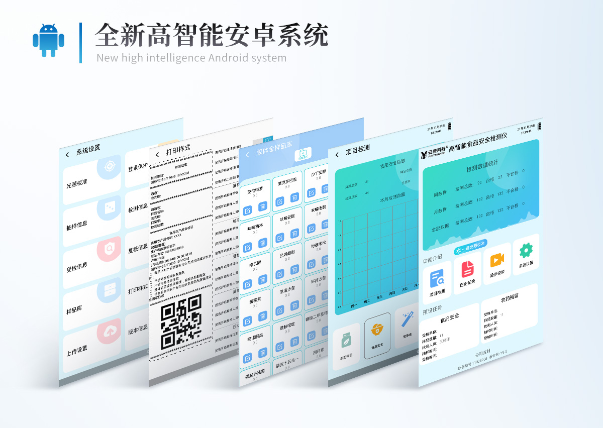 儀器采用手提式一體化系統檢測技術,將分光光度模塊、膠體金檢測模塊、新型農殘檢測模塊、數字化管理模塊、無線通訊模塊高度集成于一體,支持檢測200種食品安全檢測項目,同時預留升級檢測方法。儀器檢測模塊標準化、智能化,檢測項目可隨意自由組合。檢測箱體內置多個標準檢測單元,檢測模塊可以調整配置。 顯示屏幕:儀器采用10.1英寸豎向液晶觸摸屏顯,搭配運行安卓智能操作系統,主控芯片采用ARM Cortex-A7,RK3288/4核處理器,主頻1.88Ghz,操作方便,性能更強。檢測通道:≥12通道;采用精密旋轉比色池設計,使用同芯片同光源校準精度,解決不同光源之間的誤差值,更加準確**。(1-12通道間誤差0.1%,***:**202022821055.2)儀器光源:高精度進口四波長冷光源,每個通道均配置 410、520、590、630nm 波長光源,標配**的光路切換裝置,專利光路切換功能可實現64波長,并且所有檢測項目可實現所有通道同時檢測。設備可一鍵校準,自動保存校準數據,自動對比校驗,得到精準光源,采用Android SP存儲數據,光源數據永不丟失,方便每一次使用。通訊接口:配備無線通信模塊、4G(APN)通訊模塊、藍牙傳輸,同時具有雙USB接口以及RJ45網線接口,可以多方式實現數據保存及數據傳輸。 存儲方式:支持U盤存儲,標準USB接口,免驅動安裝。檢測結果存儲容量20萬條以上,可生成Excel表格進行拷貝,并具有登錄保護功能。智能化操作系統:: ★操作系統:儀器可在同一檢測界面自動對應相關檢測通道,一次性選擇1-12個樣品名稱,無需退出界面,節省操作時間。并可以對每個通道屬性和樣品信息單獨進行編輯,例如送檢單位、人員,檢測人員等,打印時勾選打印顯示。★數據集成系統:設備首頁自動匯總分析檢測數據,包含:周檢測數據、月檢測數據,全部檢測總數量,均包含檢測總數,合格數,不合格數,以及相關柱形分析圖,各項檢測數據一目了然,無需電腦查詢,更加快捷直觀。★數據庫系統:十幾項數據庫分類管理儀器:包含項目類型、項目數據、檢測數據、歷史記錄、國標信息、曲線信息、采樣信息、檢測信息、受檢信息、復核信息、圖表信息、光源校準信息、打印樣式信息、樣品庫信息等等,數據庫之間互相協調聯動保證數據的真實完整性。同時產品數據庫以及歷史檢測記錄支持一鍵檢索功能。★限量規判系統:具有限量查詢、添加物質合規判定系統。檢測出結果后,系統自動調用系統數據庫中相關國標進行比對判定,客觀顯示判定結果是否合格★項目預設系統:儀器具有任務預設模塊,一鍵提前預設,給出方便快捷的新檢測方案,每一個任務分別可以設置不同的樣品、批次、編號、來源、備注、抽樣信息、檢測信息、受檢信息、復核信息等更多信息。樣品送檢時一鍵調取保存信息,并可多次調取,大大提高檢測效率。★數據監管系統:同步對接監管平臺,數據可局域網和互聯網數據上傳,檢測結果可選擇直接傳至食品安全監管平臺。進行區域食品安全監管及大數據分析處理與數據統計,檢測區域食品安全長短期動態,達到食品安全問題預估、預警。★打印系統:內置全新打印機,新創自定義打印方式,可按需靈活勾選控制:產品合格證(國家農業部標準要求),二維碼,抽樣信息、檢測信息,受檢信息、復核信息、抽樣日期、檢測日期等信息的打印。供電模式:儀器交直流兩用,直流12V供電,可連接車載電源,可配6ah大容量充電鋰電池,電量可實時顯示,方便戶外流動測試。膠體金檢測模塊:采用雙通道CMOS成像處理技術及膠體金免疫層析技術,可同時讀取雙膠體金卡數據,自動采集、處理分析,將檢測結果顯示,并可根據參考限值自動判斷檢測結果,可檢測常見的獸藥殘留、生物毒素、抗生素、違禁添加物等。★探測技術:CMOS成像探測;★檢測通道:1個通道;★檢測方式:消線法和比色法;★顯示模式:陰性或陽性;★曲線形式:軌道式掃描方式,顯示金標卡圖像,實時生成、識別CT曲線圖,無需手動調整,完成檢測后自動退出檢測卡。兼容市場上其他金標卡,使用耗材不受限制。儀器加入遠程升級功能,可定向分客戶分儀器更新,開機后自動更新,客戶無需任何操作,即可升級全新項目。做到了無需退換機器即可實現實時遠程升級檢測儀器。
