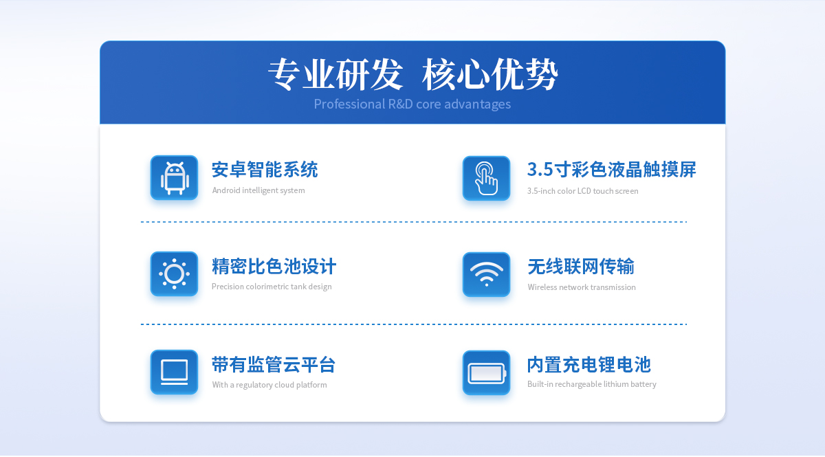 | ①安卓智能系統,操作更佳簡便快捷; | ②配置云監控平臺,檢測結果可直接無線傳至平臺,進行水質長短期分析,輔助管理。 | ③內置操作流程、操作簡單、無需培訓、直接上手; | ④檢測速度更快,現場讀取數據; | ⑥便攜式體積小,重量輕,方便戶外檢測; | ⑦外形小巧美觀,工作穩定免維護,具有較好的性價比; | ⑧采用進口冷光源,光學性能穩定,壽命長達10萬小時; | ⑨交直流兩用,內置充電鋰電池,環保耐用可支持連續室內外工作。 |