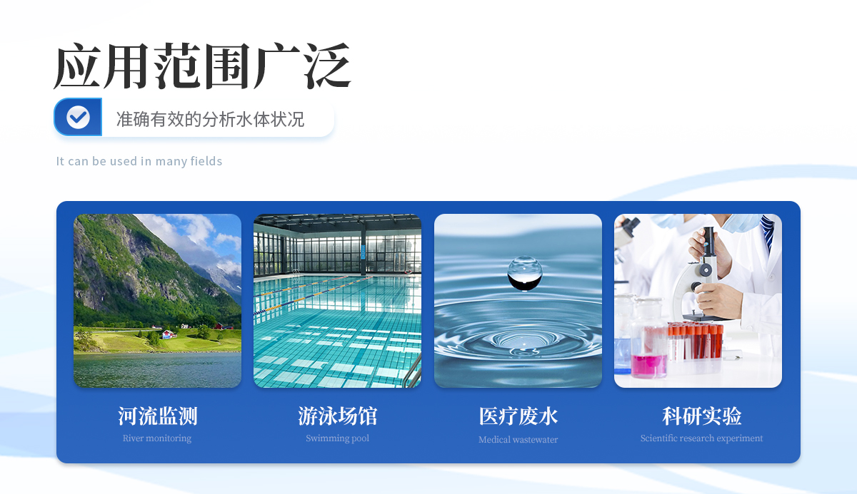 | 適用于飲用水、自來水、醫療廢水、工業污水、河流監測、游泳場館、水源保護、科研實驗等。 |