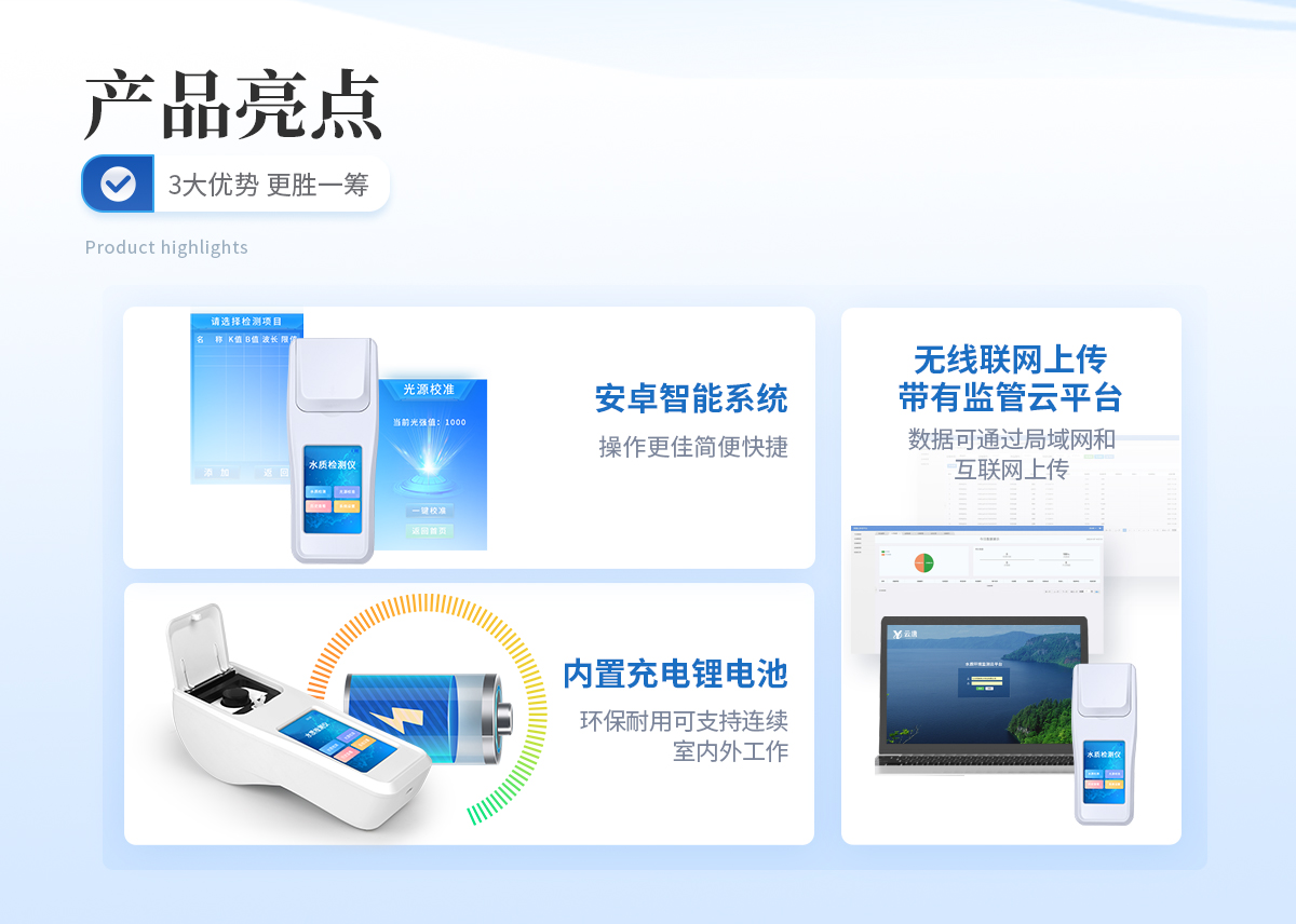 | ①安卓智能系統,操作更佳簡便快捷; | ②配置云監控平臺,檢測結果可直接無線傳至平臺,進行水質長短期分析,輔助管理。 | ③內置操作流程、操作簡單、無需培訓、直接上手; | ④檢測速度更快,現場讀取數據; | ⑥便攜式體積小,重量輕,方便戶外檢測; | ⑦外形小巧美觀,工作穩定免維護,具有較好的性價比; | ⑧采用進口冷光源,光學性能穩定,壽命長達10萬小時; | ⑨交直流兩用,內置充電鋰電池,環保耐用可支持連續室內外工作。 |