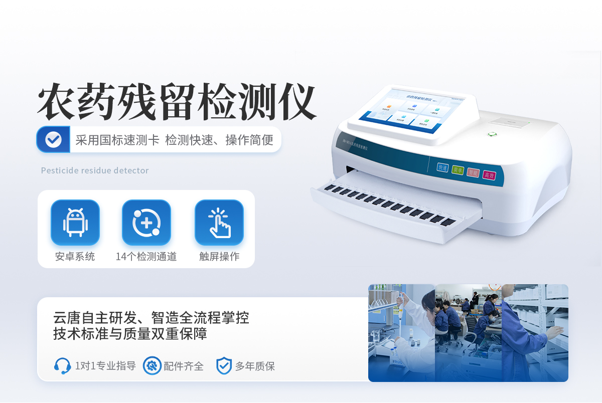 該儀器為云唐科技新研發一款農殘快速檢測儀,采用國標速測卡,使檢測速度更快,操作更加簡便。檢測標準:依據國家標準方法(GB/T5009.199-2003)以及世界衛生組織WHO、世界糧農組織FAO殘留農藥檢測標準、世界環境保護局EPA參照攝入量等要求來設計。