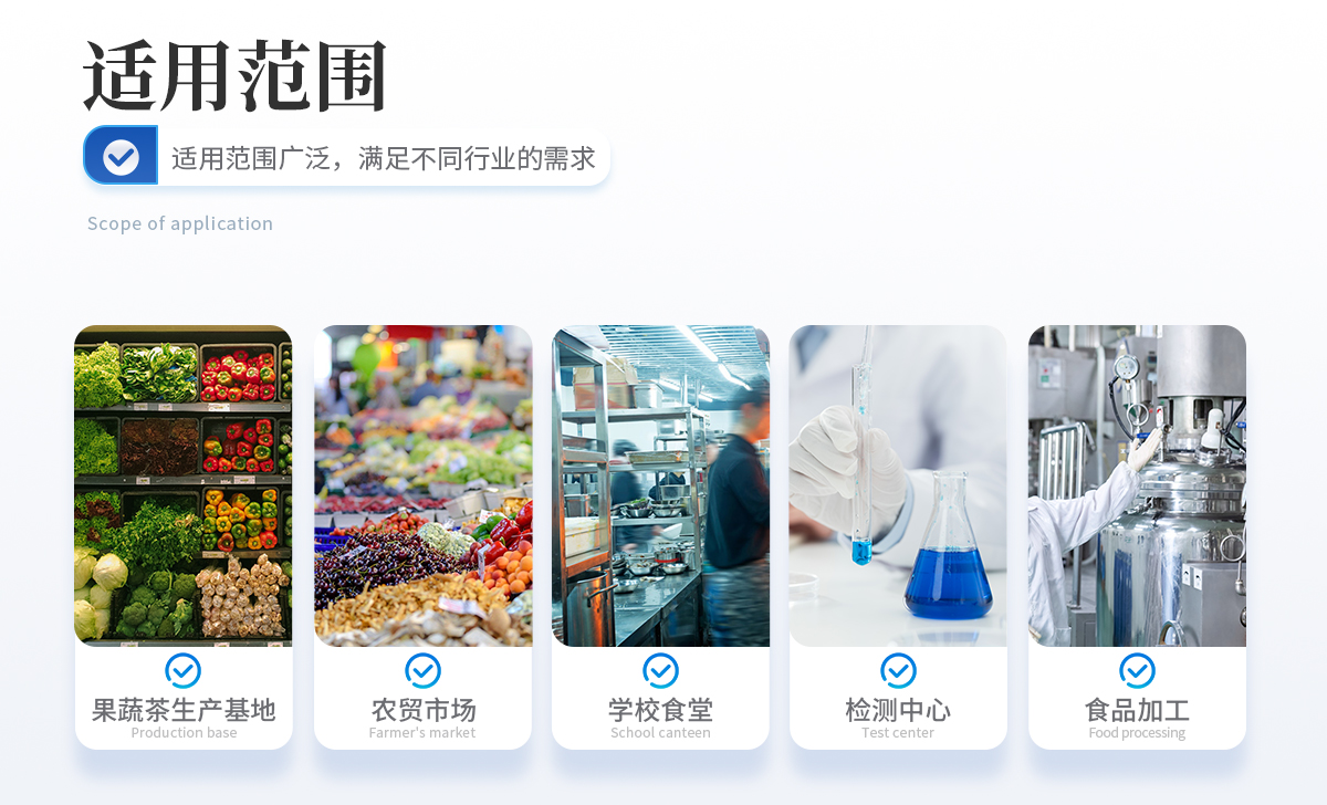 采用酶抑制率比色法對蔬菜、水果、茶葉、糧食、農副產品等食品中有機磷和氨基甲酸酯類農藥殘留含量進行快速準確的檢測;廣泛應用于果蔬茶生產基地和農貿批發銷售市場現場檢測、農業部門、學校食堂、市場監管局、檢測中心等的安全速測。