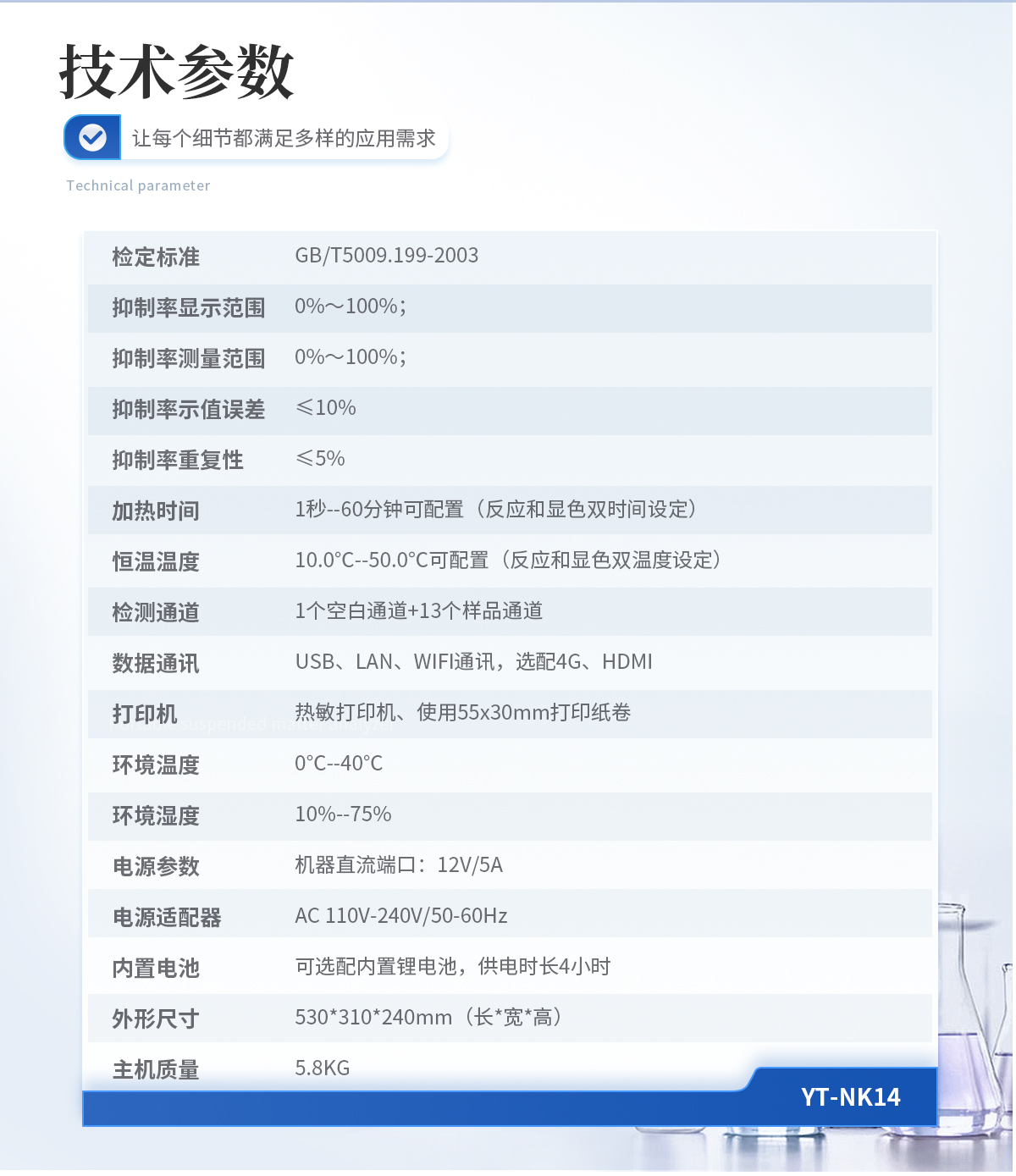 | 檢定標準:GB/T5009.199-2003 | 抑制率顯示范圍:0%~100%; | 抑制率測量范圍:0%~100%; | 抑制率示值誤差:≤10% | 抑制率重復性:≤5% | 加熱時間:1秒--60分鐘可配置(反應和顯色雙時間設定) | 恒溫溫度:10.0℃--50.0℃可配置(反應和顯色雙溫度設定) | 檢測通道:1個空白通道+13個樣品通道 | 數據通訊:USB、LAN、WIFI通訊,選配4G、HDMI | 打印機:熱敏打印機、使用55x30mm打印紙卷 | 環境溫度:0℃--40℃ | 環境濕度:10%--75% | 電源參數:機器直流端口:12V/5A | 電源適配器:AC 110V-240V/50-60Hz | 內置電池:可選配內置鋰電池,供電時長4小時 | 外形尺寸:530*310*240mm(長*寬*高) | 主機質量:5.8KG |